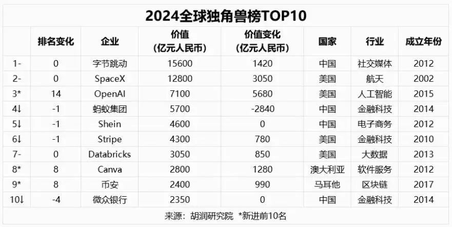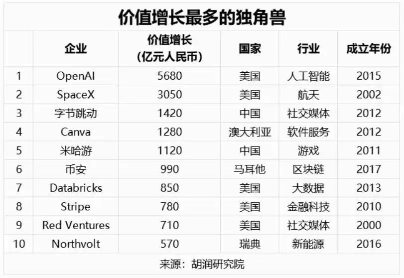 前十名增长价值1.4万亿元人民币,占全榜单增长价值的45%。其中,三家新面孔:总部旧金山的OpenAI、总部澳大利亚的Canva和总部马耳他的币安。去年位居前十的Telegram和Revolut跌至前30名,菜鸟网络跌至前50名。