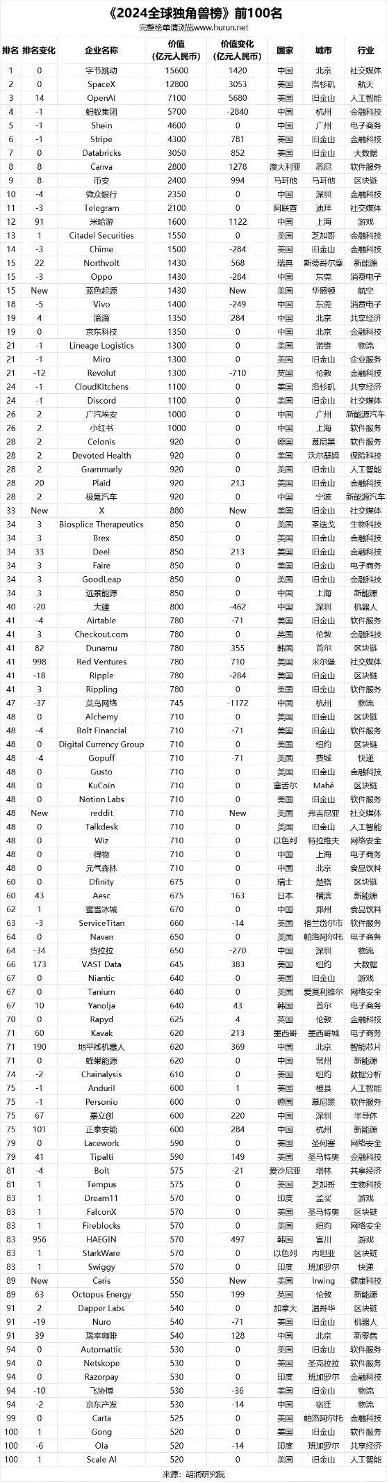 过去一年全球表现最好的独角兽是OpenAI,价值增长近5700亿元,达到7100亿元,跻身全球前三。它成功推出了ChatGPT,并发布了文生视频模型Sora,预示着一个新的AI时代的到来。