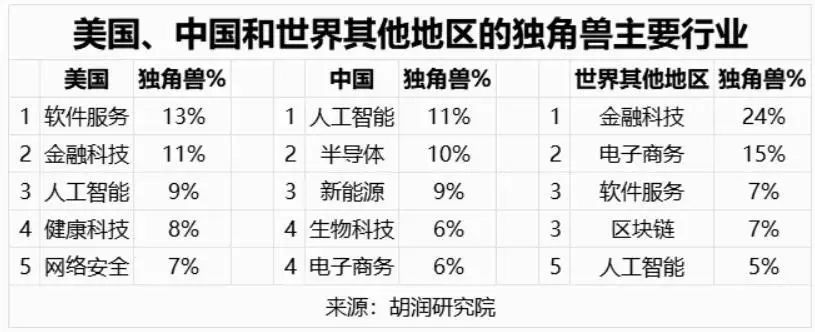 根据排行榜,世界现在可以分为三部分:美国、中国和世界其他地区。美国拥有世界上近一半的已知独角兽,主要来自软件服务、金融科技和人工智能行业。中国拥有四分之一,主要来自人工智能、半导体和新能源。世界其他地区拥有另外四分之一,主要来自金融科技和电子商务。