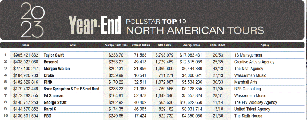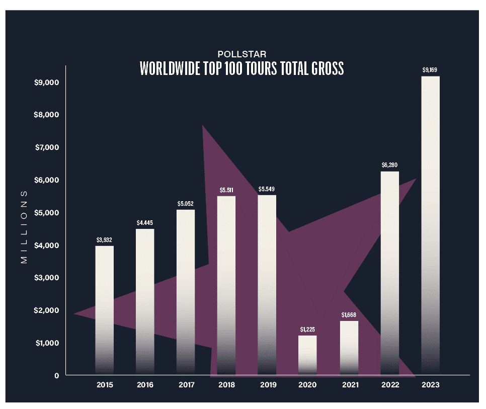 同样在2023年,所有五个级别的场馆(体育场、竞技场、圆形剧场、剧院和俱乐部)在Pollstar的顶级场馆排行榜上都实现了两位数的增长,尤其是体育场,增长了35%;竞技场增长了38%。