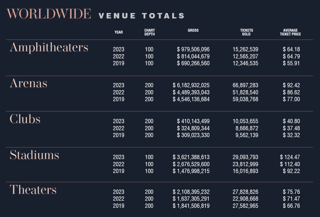 排名前100的体育场馆今年的票房收入较去年增长22%,从去年的26.8亿美元增长35%,达到36.2亿美元(门票总销量为2,910万张)。全球前200球馆的票房收入高达61.8亿美元,总票房为6690万张,比2022年增长29%。