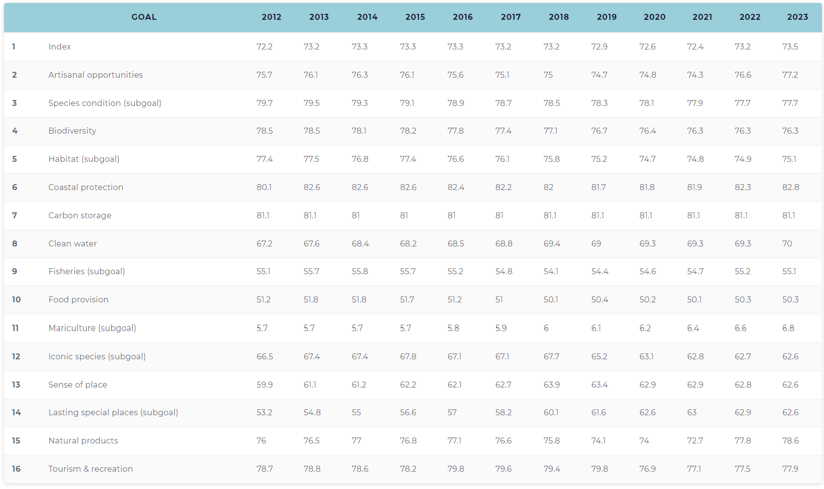 像往常一样,2023年的评估包括新一年的数据,使用从各机构和其他来源获得的最新数据进行计算。鉴于承诺使用最好的可用科学,OHI还在可用的情况下使用最新的科学和数据更新了往年的数据(2012-2023)。这些结果背后的数据和代码是公开的。