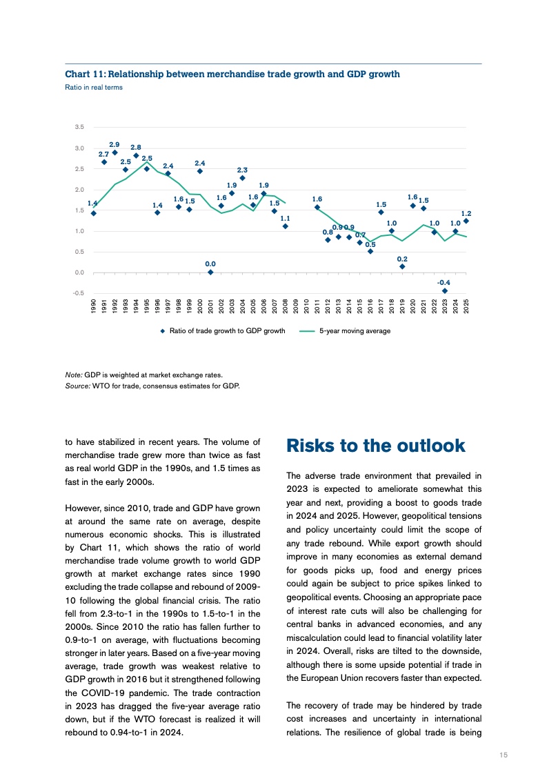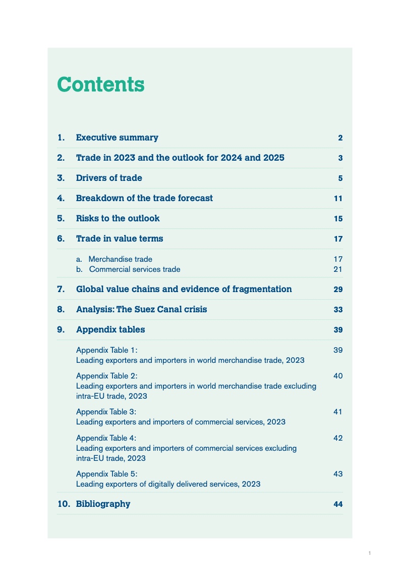 世贸组织首席经济学家拉尔夫-奥萨说:“一些国家的政府对贸易带来的益处更加怀疑,并已采取措施,重新进行生产外包,将贸易转向友好国家。世界上两条主要航运线路的中断也在考验着贸易的复原力:巴拿马运河受到淡水短缺的影响,红海的交通也发生了改道。在这些持续干扰、地缘政治紧张局势和政策不确定性的条件下,贸易前景面临的风险偏向下行。”