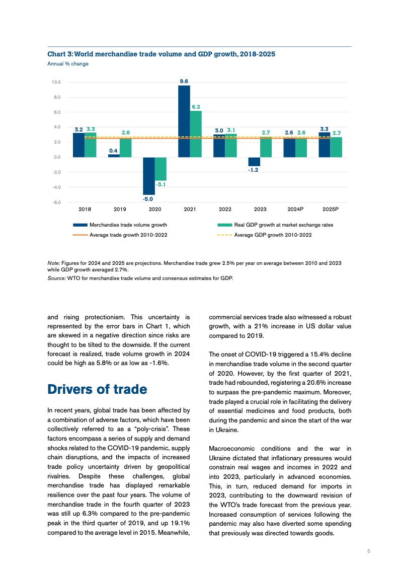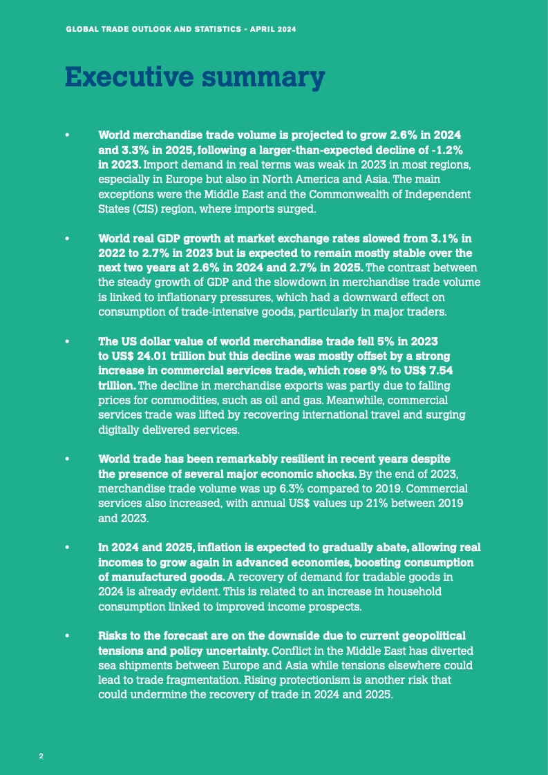 世贸组织总干事恩古齐-奥孔乔-伊韦拉说:“我们正在全球贸易复苏方面取得进展,这要归功于具有弹性的供应链和稳固的多边贸易框架——这对改善民生和福利至关重要。我们必须降低地缘政治纷争和贸易分裂等风险,以保持经济增长和稳定。”