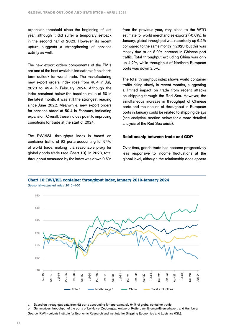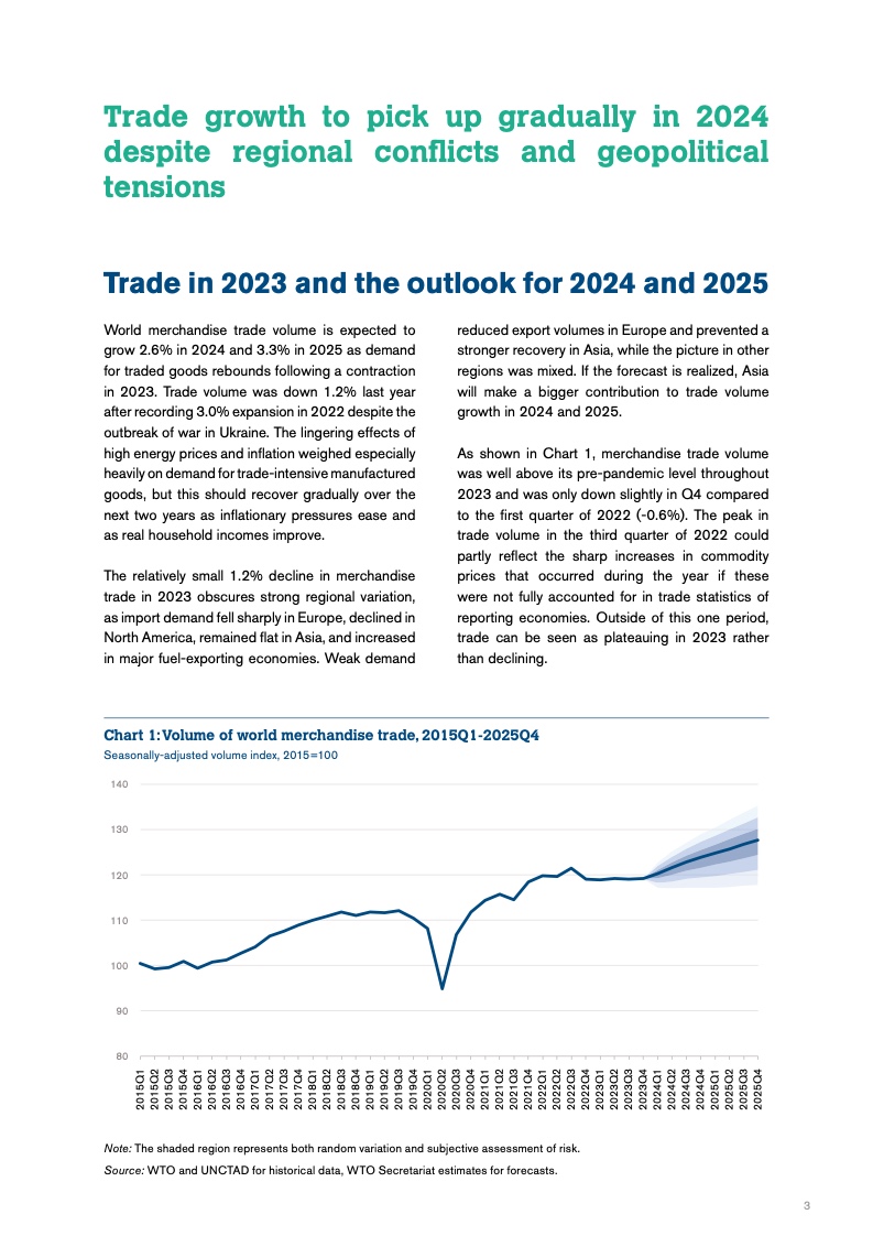 世贸组织经济学家在最新的《全球贸易展望与统计》报告中指出,预计今年通胀压力将减弱,从而使实际收入再次增长——特别是在发达经济体——从而推动制成品消费。2024 年对贸易商品的需求复苏已经显现,新出口订单指数表明今年年初的贸易条件将有所改善。