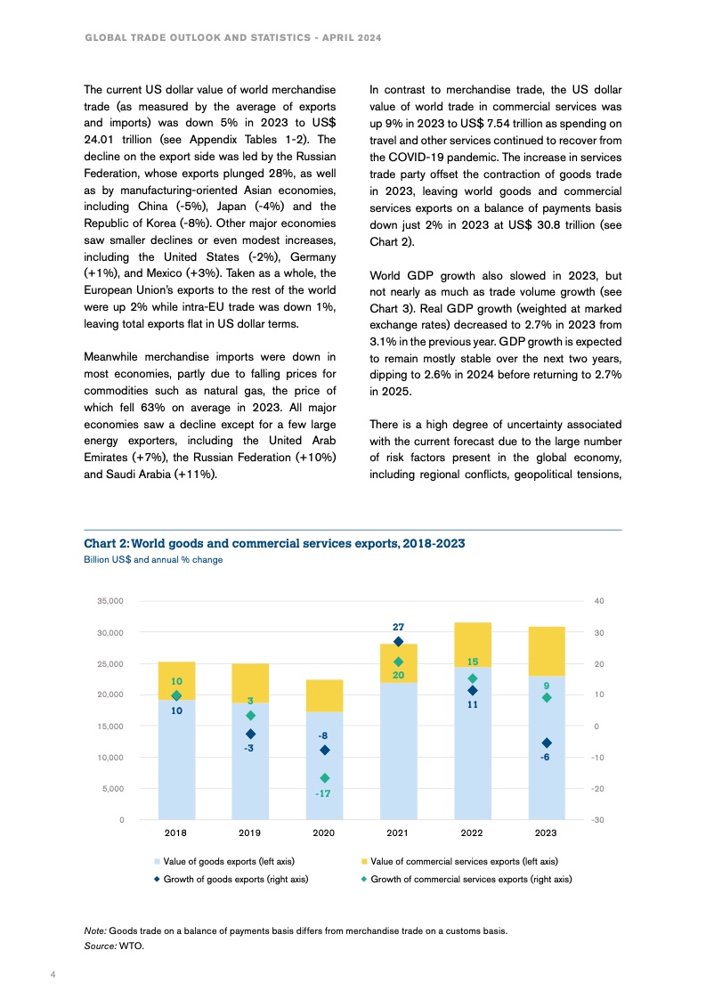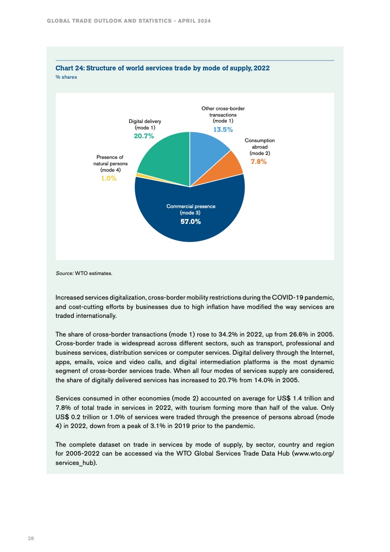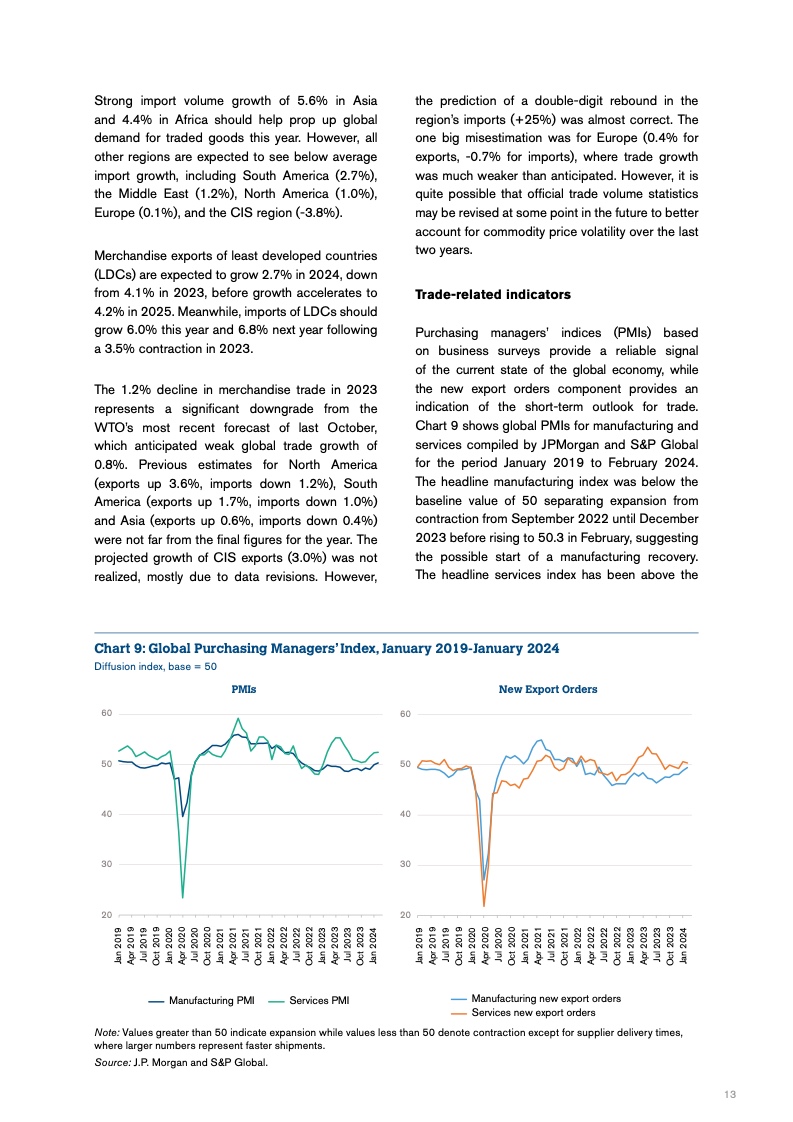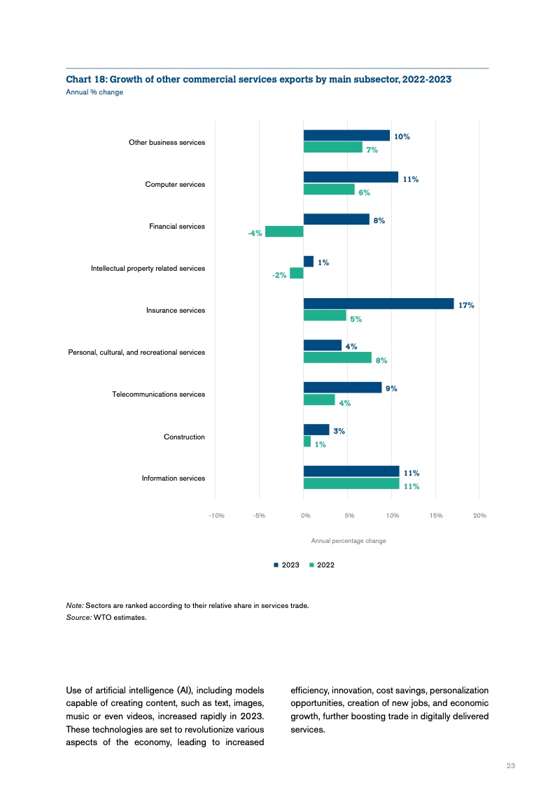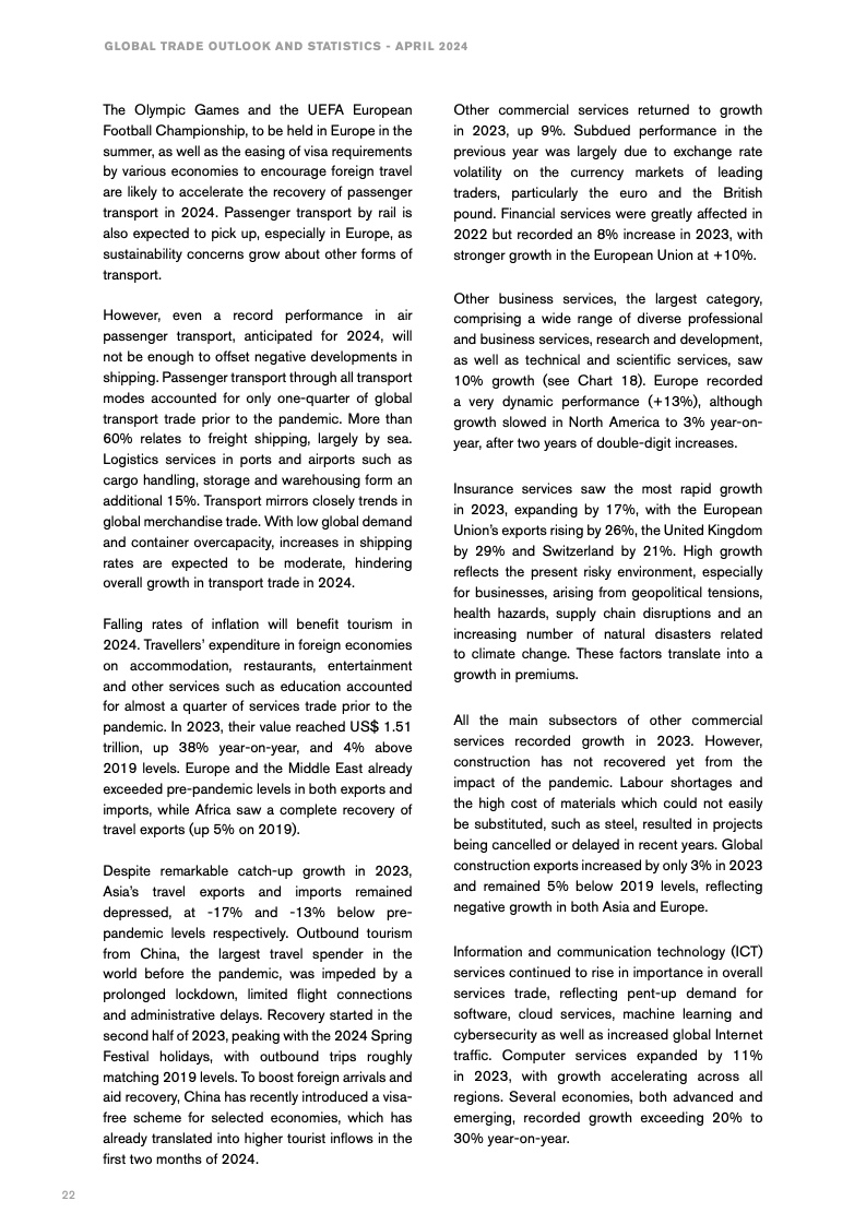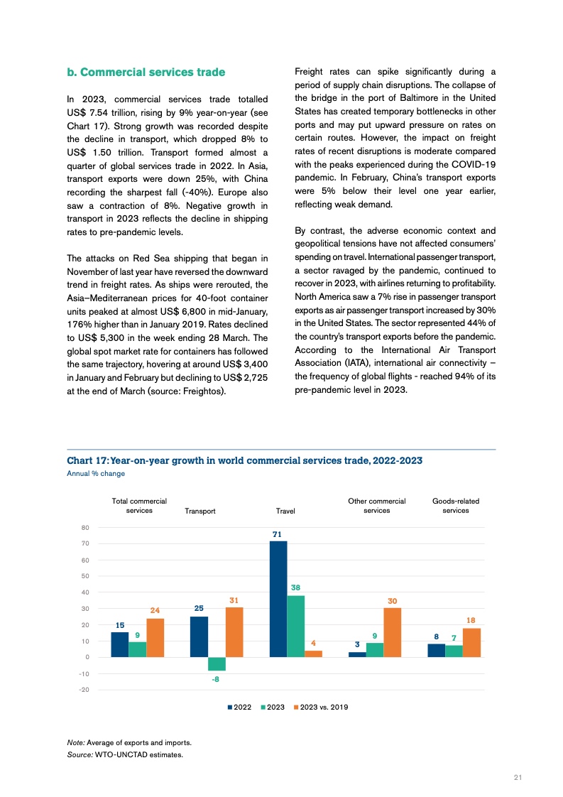 2023 年,尽管货运量有所下降,但世界商业服务贸易仍增长了 9%,这主要得益于国际旅游的复苏和数字交付服务的激增。2024 年,欧洲将在夏季举办体育赛事,各国也将放宽签证要求,预计这将促进旅游业和客运业的发展。