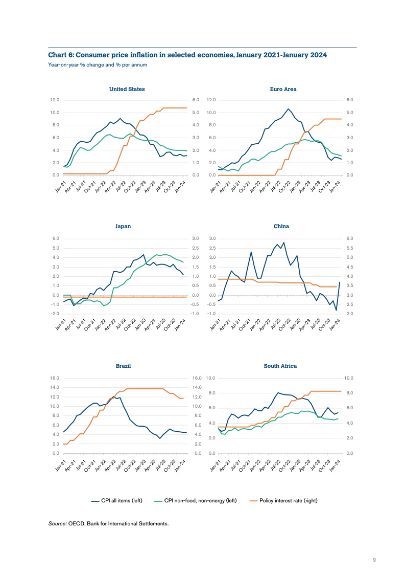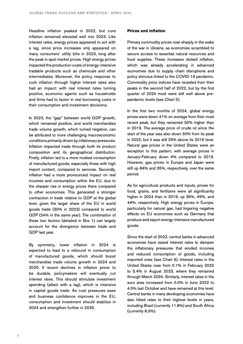 报告进一步估计,按市场汇率计算的全球国内生产总值增长率在未来两年将基本保持稳定,2024 年为 2.6%,2025 年为 2.7%,而 2023 年将从 2022 年的 3.1%放缓至 2.7%。实际国内生产总值的稳定增长与实际商品贸易量的放缓之间的反差与通胀压力有关,通胀压力对贸易密集型商品的消费产生了下行影响,尤其是在欧洲和北美。