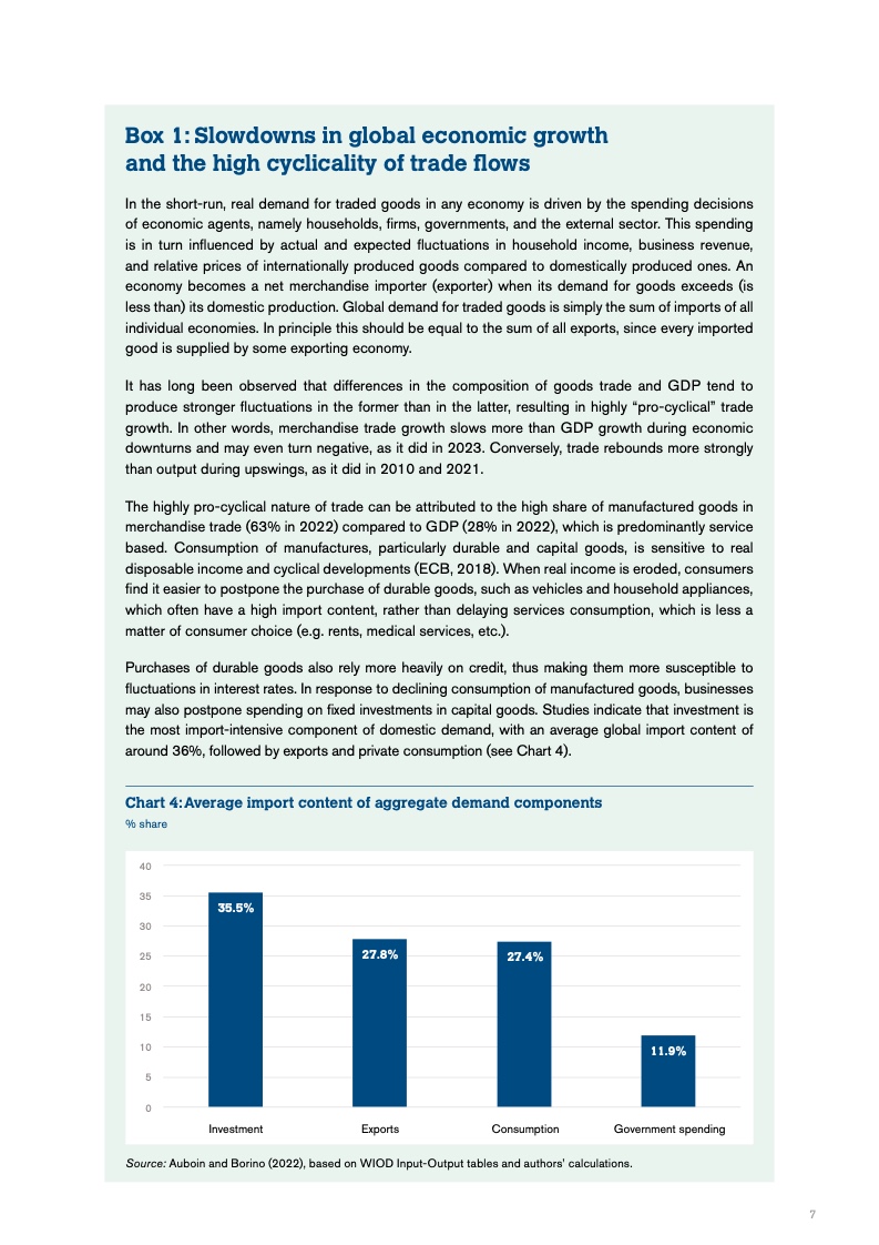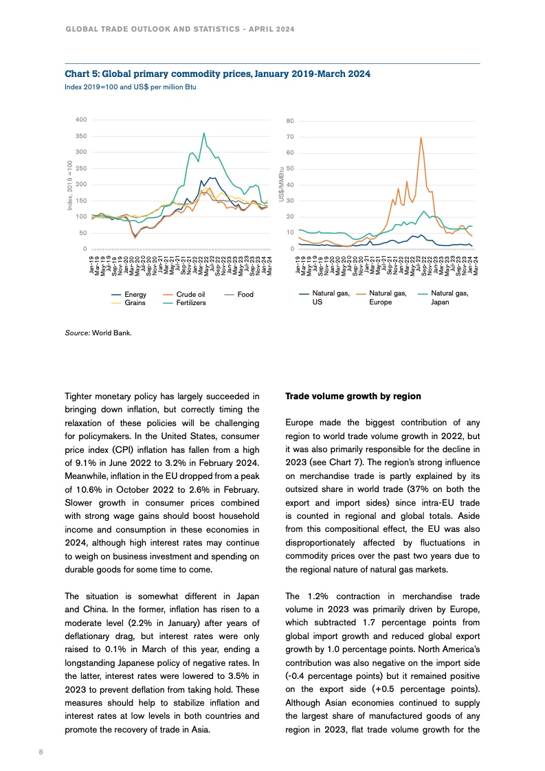 大多数地区的进口量都有所下降,尤其是欧洲,进口量急剧下降。主要的例外是大型燃料出口经济体,它们的进口因出口收入强劲而得以维持,因为按照历史标准,能源价格仍然居高不下。在整个 2023 年,世界贸易仍远高于新冠疫情前的水平。