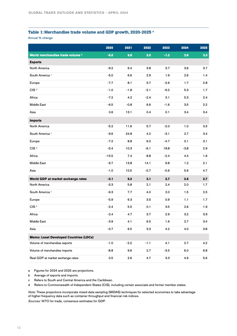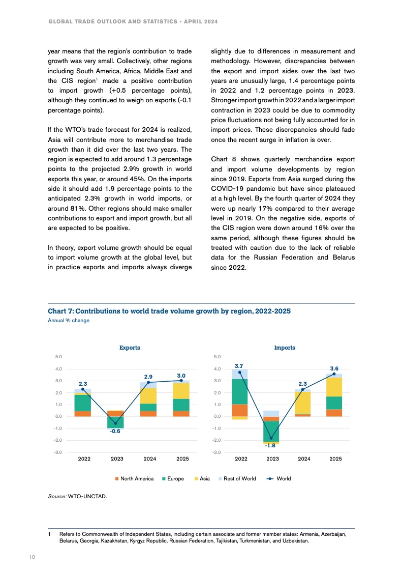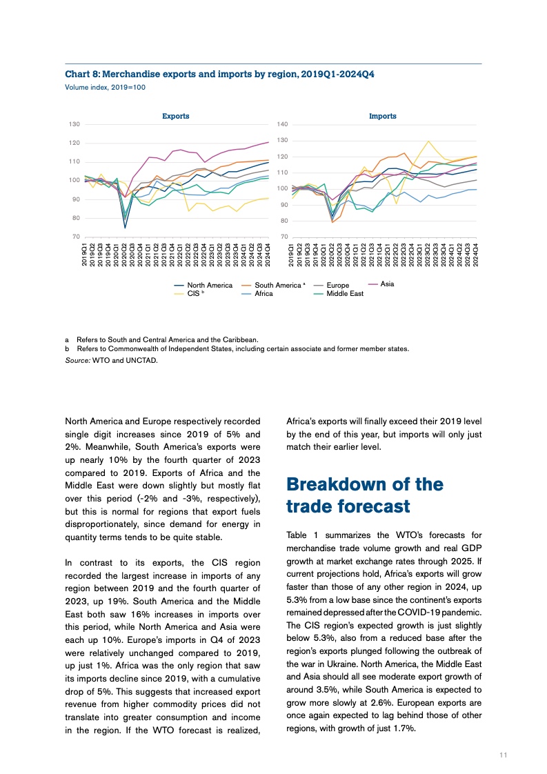 如果目前的预测成立,2024 年非洲的出口增长将比任何其他地区都快,增长 5.3%;但这一增长的基数较低,因为新冠疫情后非洲大陆的出口仍然低迷。独联体地区的预期增长率略低于 5.3%,也是由于该地区在俄乌冲突后出口骤降,基数较低。北美(3.6%)、中东(3.5%)和亚洲(3.4%)的出口都将实现适度增长,而南美的增长预计将较为缓慢,为 2.6%。欧洲出口预计将再次落后于其他地区,仅增长 1.7%。