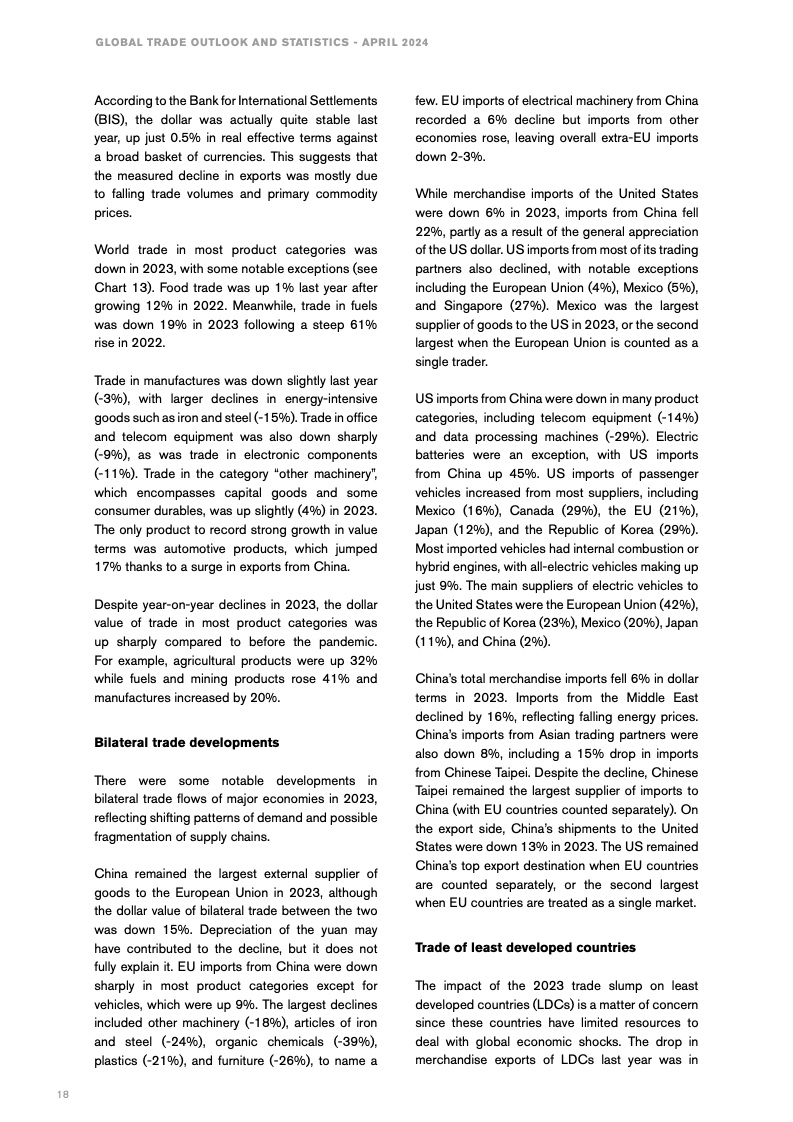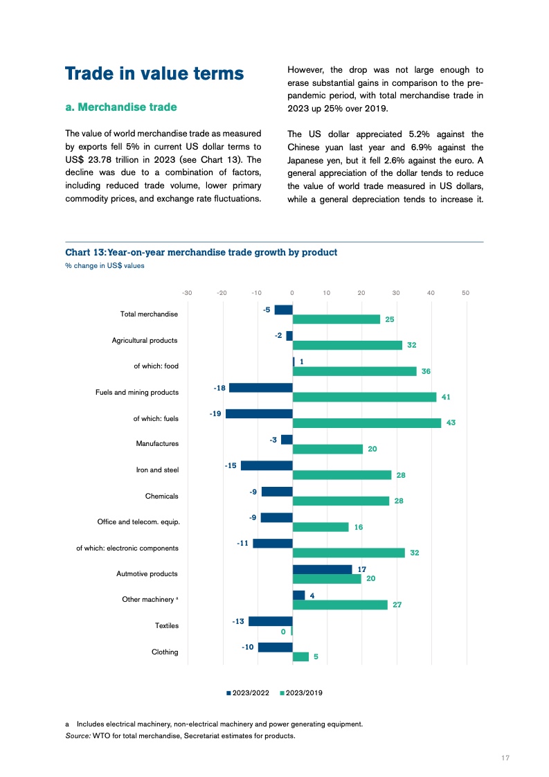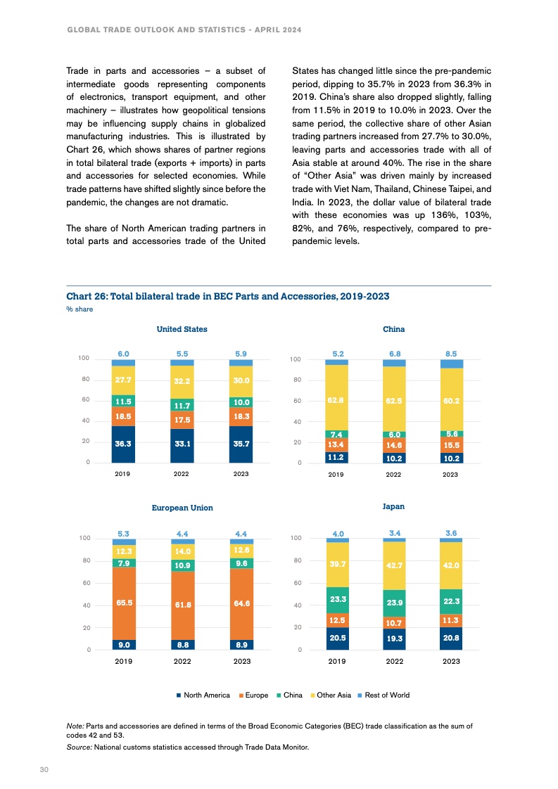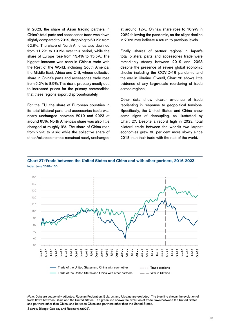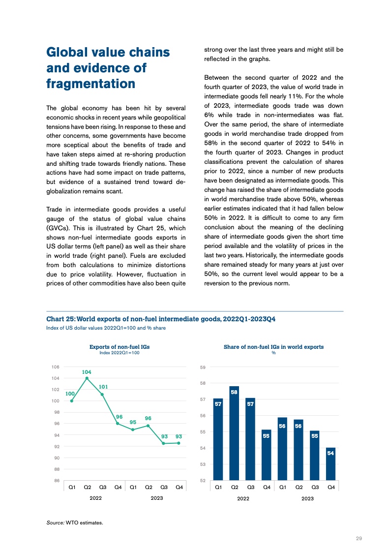 报告还提供了新的数据,表明地缘政治紧张局势对贸易模式产生了轻微影响,但并未引发持续的去全球化趋势。美国和中国的双边贸易在2022年创下历史新高,但在2023年的增长速度比世界其他国家的贸易增长速度低30%。此外,2023 年全年,全球非燃料中间产品贸易下降了 6%。