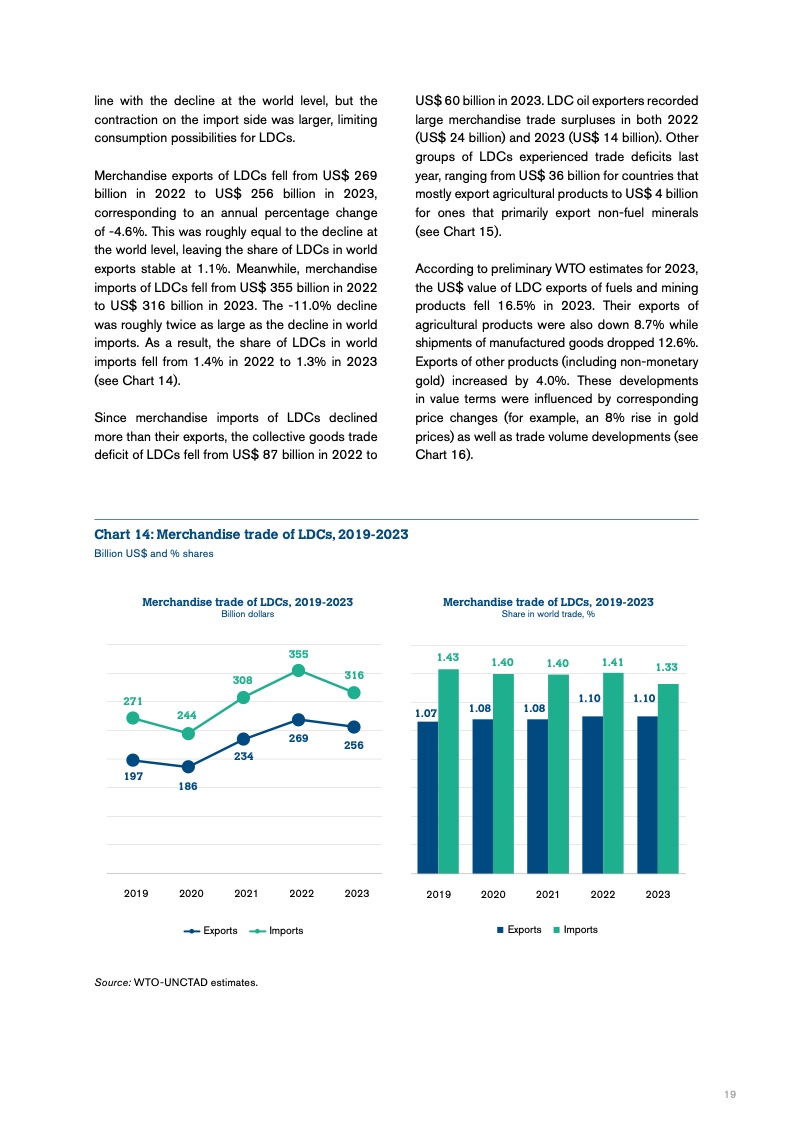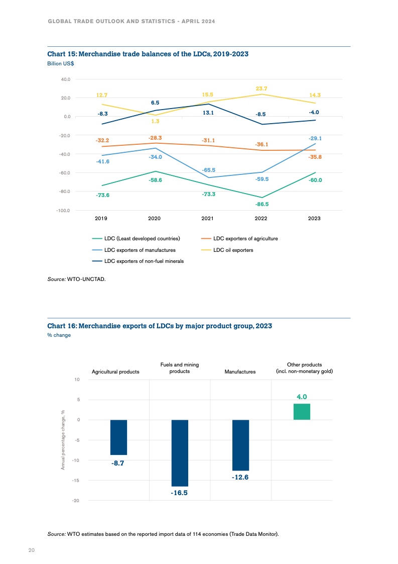 最不发达国家的商品出口预计将在2024年增长2.7%,低于2023年的4.1%,然后在2025年加速增长至4.2%。同时,最不发达国家的进口在2023年收缩3.5%之后,今年和明年将分别增长6.0%和6.8%。