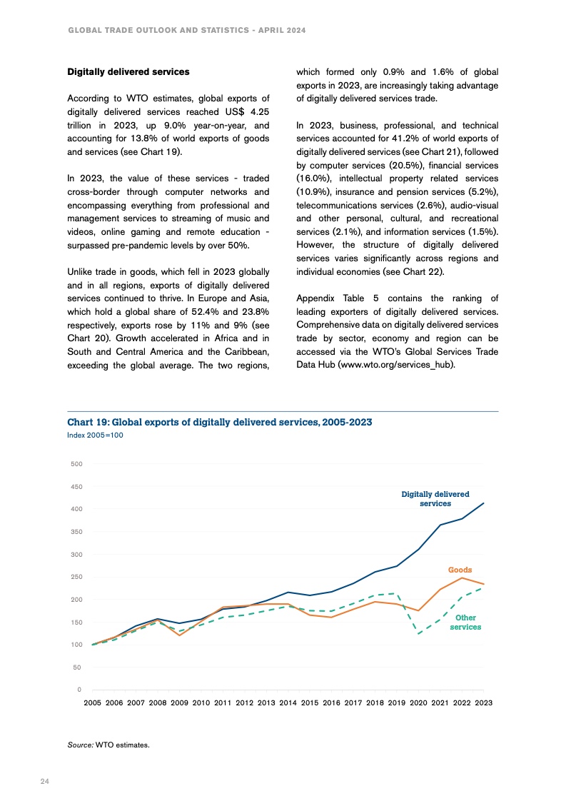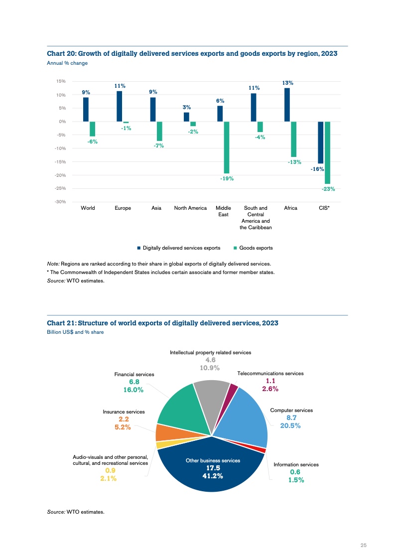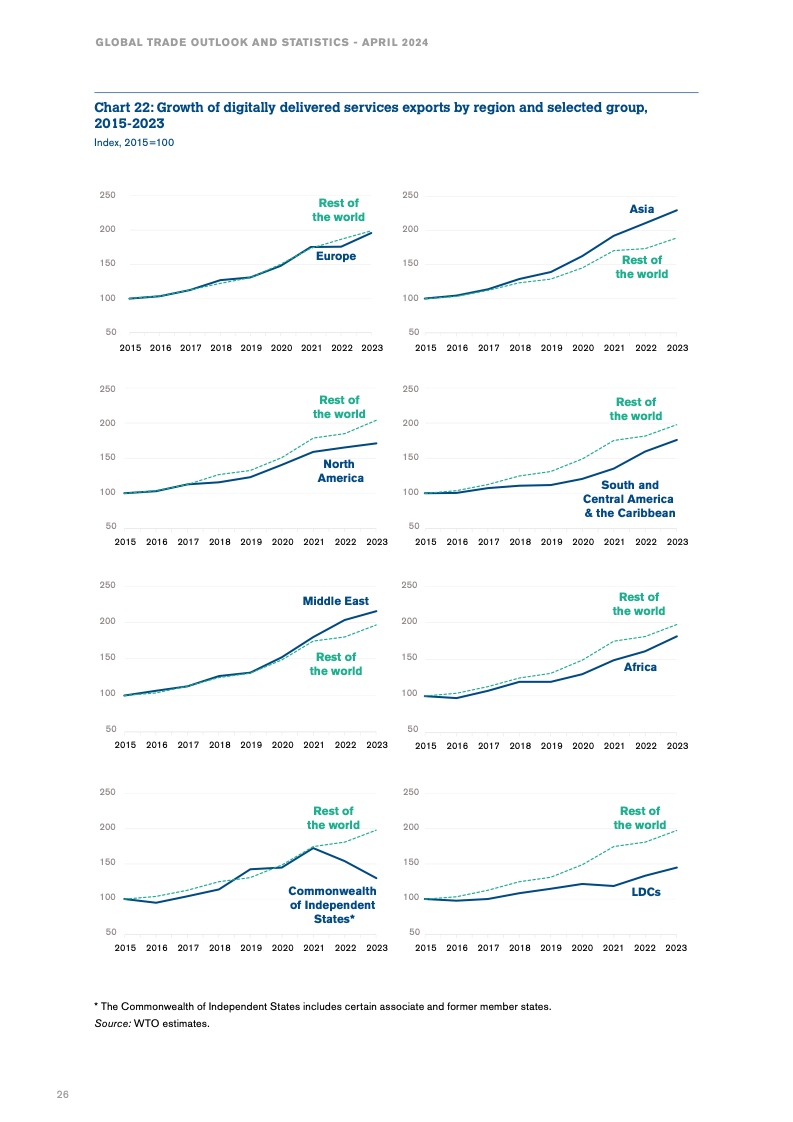 2023 年,全球数字交付服务出口额飙升至 4.25 万亿美元,同比增长 9.0%,占全球商品和服务出口额的 13.8%。2023 年,这些服务(通过计算机网络进行跨境交易,包括从专业和管理服务到音乐和视频流媒体、在线游戏和远程教育等各种服务)的价值将超过新冠疫情前水平的 50%以上。欧洲和亚洲分别占全球市场份额的 52.4% 和 23.8%,出口分别增长了 11% 和 9%。非洲(13%)、中南美洲和加勒比地区(11%)的增长速度加快,超过了全球平均水平。到 2023 年,这两个地区的出口额仅占全球出口额的 0.9% 和 1.6%,但它们正走在利用数字交付服务贸易的道路上。
