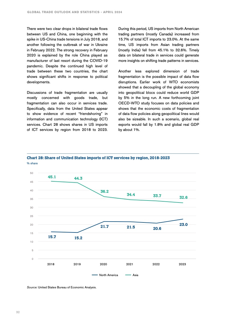服务贸易也可能出现分化迹象:美国从北美贸易伙伴(主要是加拿大)进口的信息、计算机和电信(ICT)服务在ICT进口总额中所占比例从2018年的15.7%上升到2023年的23.0%,而美国从亚洲贸易伙伴(主要是印度)进口的同样服务却从45.1%下降到32.6%。此外,根据经济合作与发展组织(Organisation for Economic Co-operation and Development)和世界贸易组织(WTO)即将发布的一份研究报告的估算,地缘政治导致的数据流政策碎片化可能导致全球商品和服务贸易实际价值下降1.8%,全球GDP下降1%。