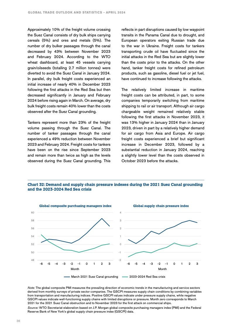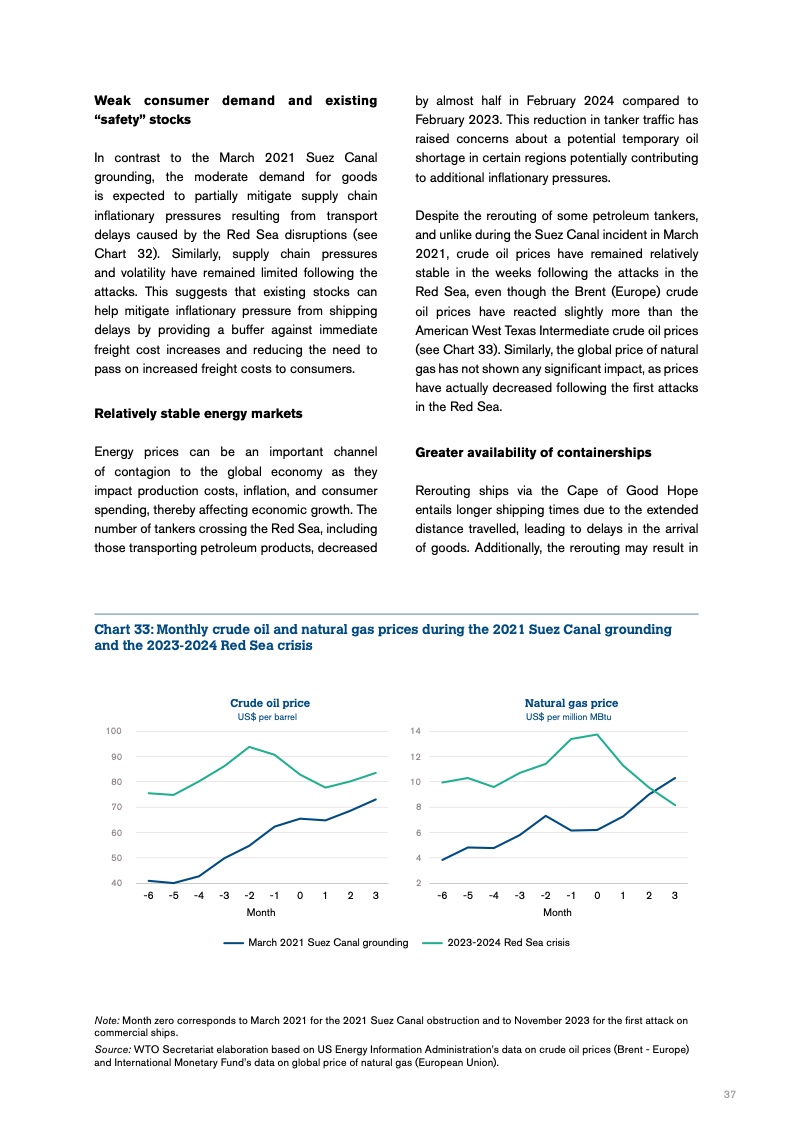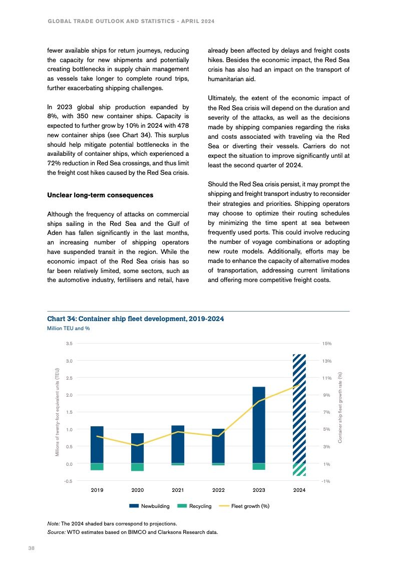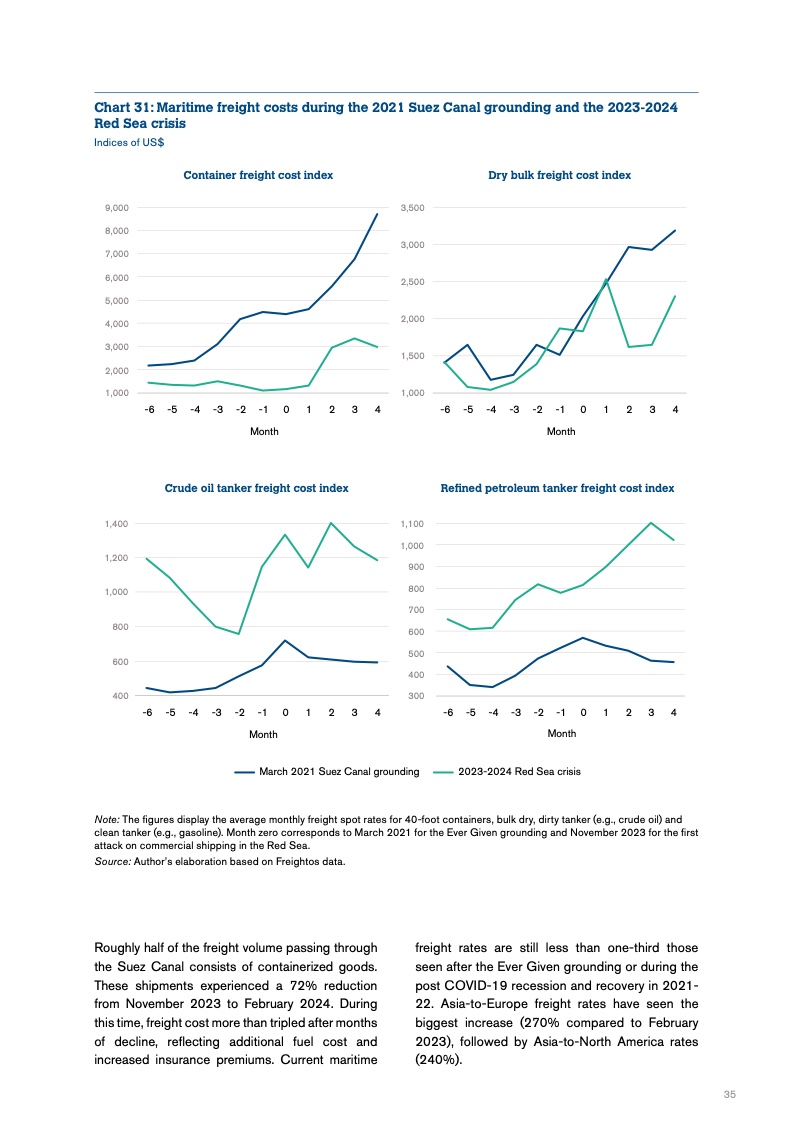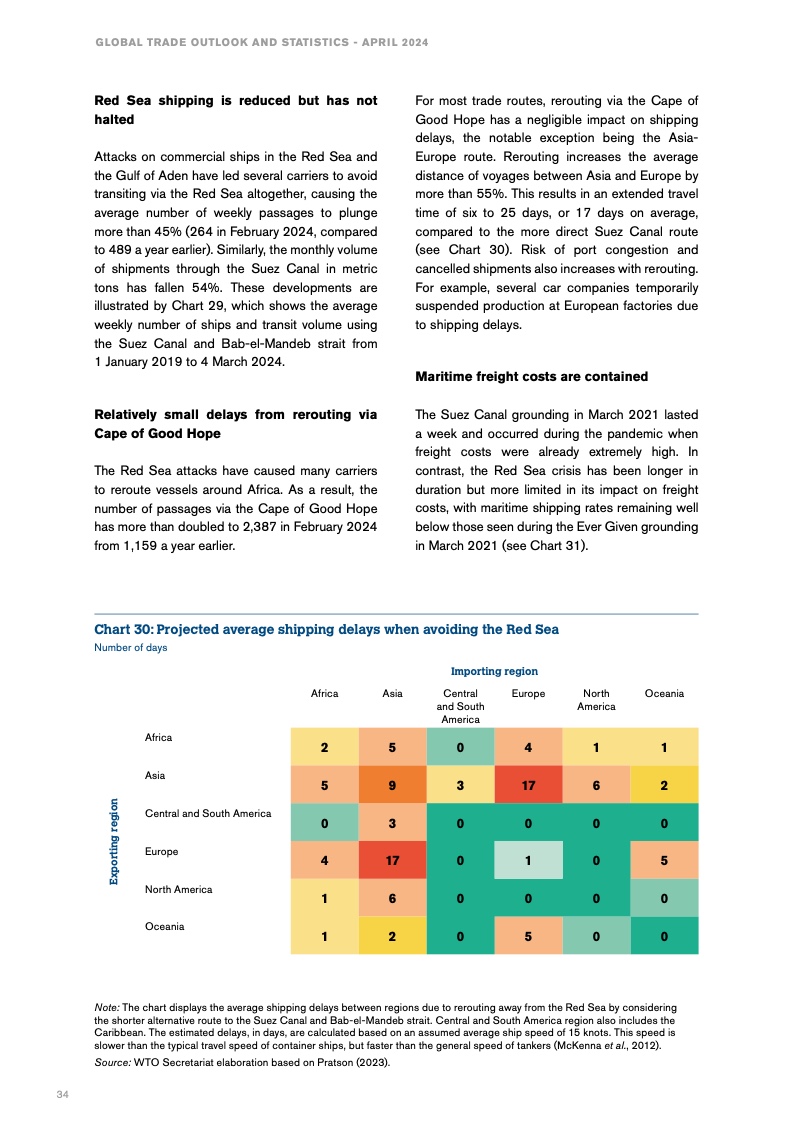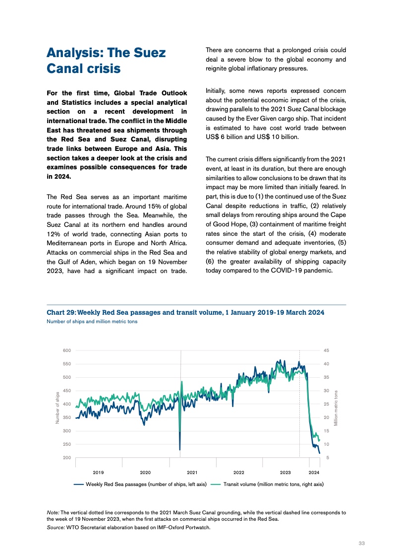 展望未来,报告警告说,地缘政治紧张局势和政策不确定性可能会限制贸易反弹的幅度。食品和能源价格可能再次受到与地缘政治事件相关的价格飙升的影响。报告中关于红海危机的特别分析部分指出,虽然中东冲突造成的苏伊士运河中断迄今对经济的影响相对有限,但汽车产品、化肥和零售等一些行业已经受到延误和运费上涨的影响。