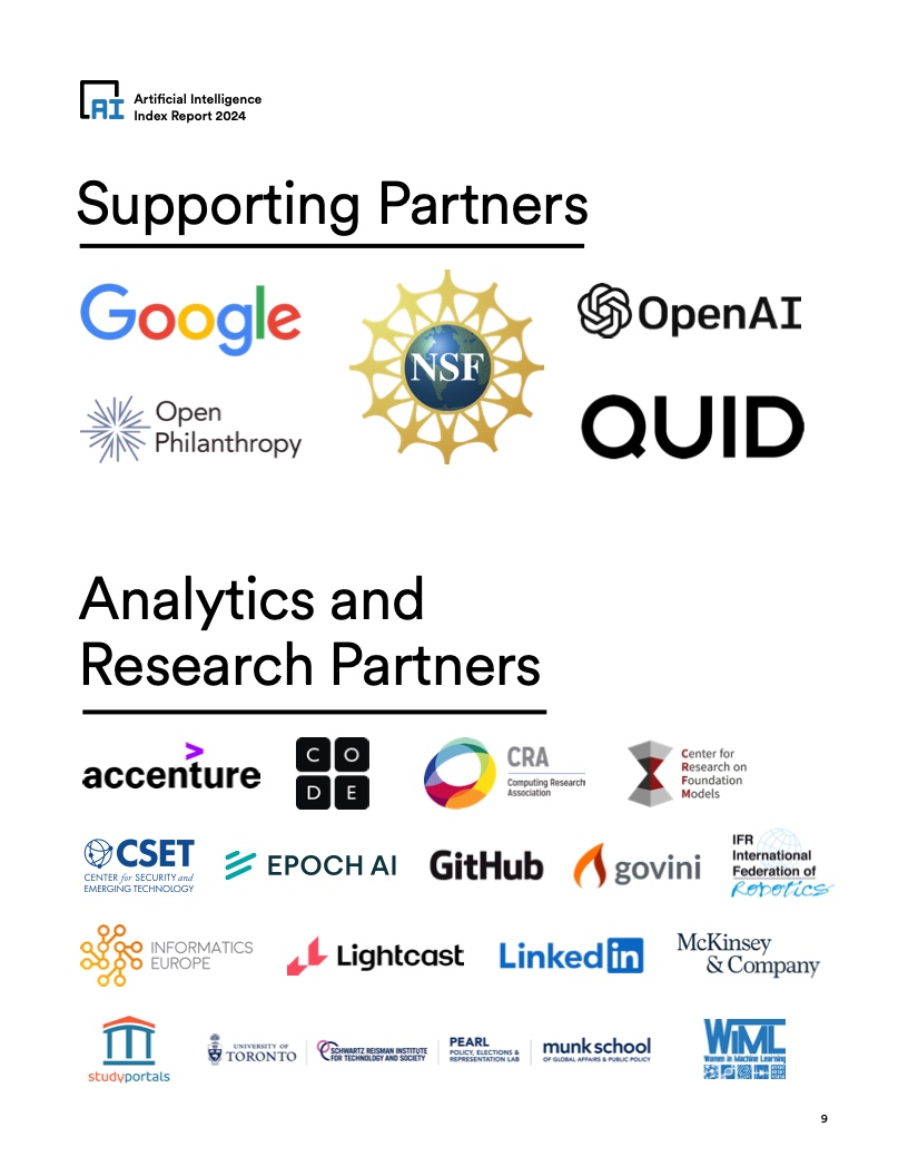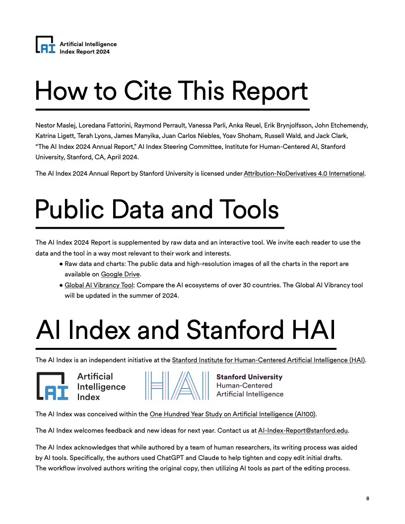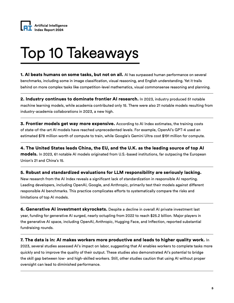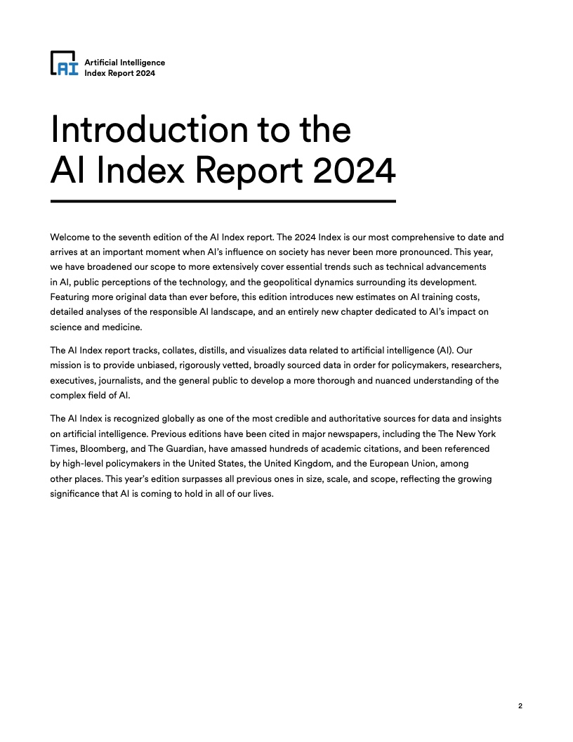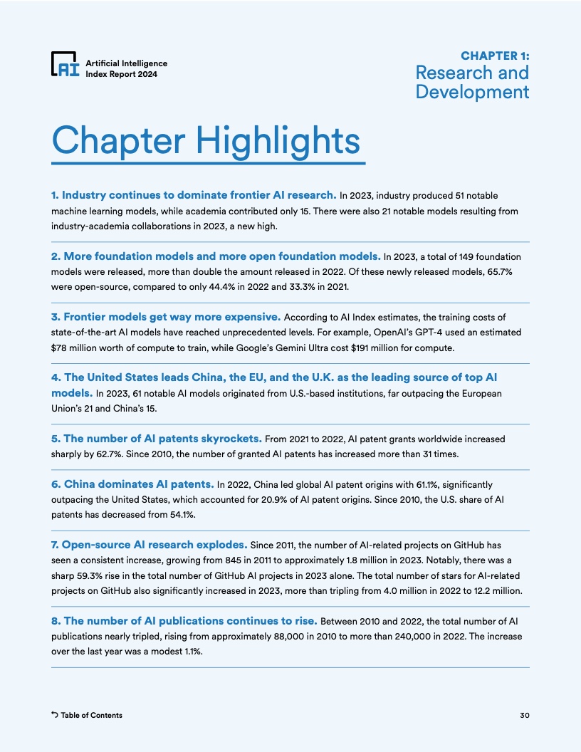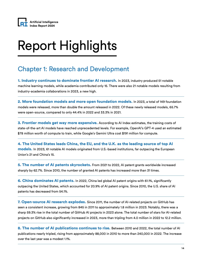 开发最先进的 AI 模型的成本越来越高。根据 AI 指数的估计,训练这些模型所需的计算资源已经达到了前所未有的水平。例如,OpenAI 的 GPT-4 模型的训练使用了价值约 7800 万美元的计算资源,而 Google 的 Gemini Ultra 模型的训练成本更是高达 1.91 亿美元。