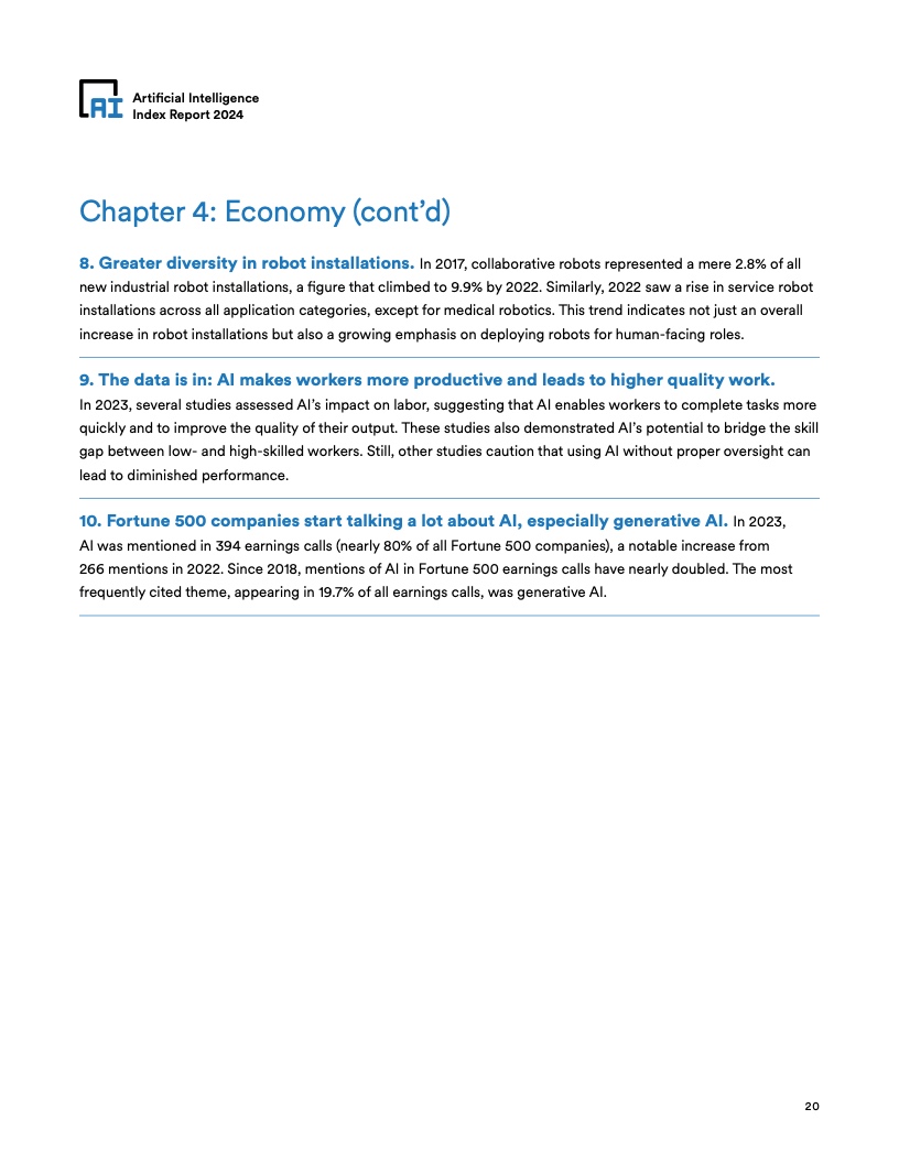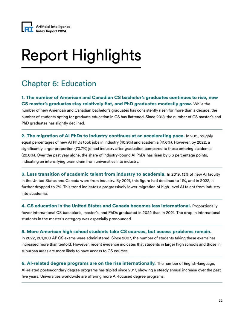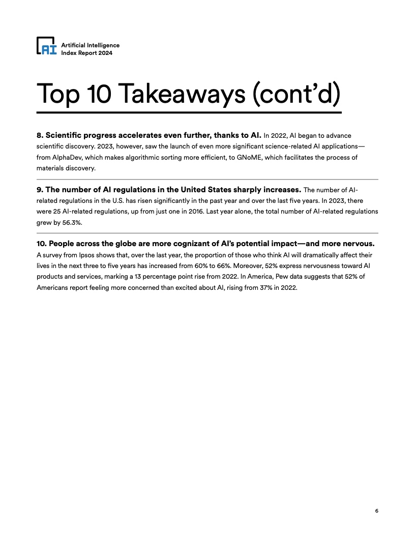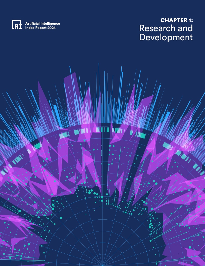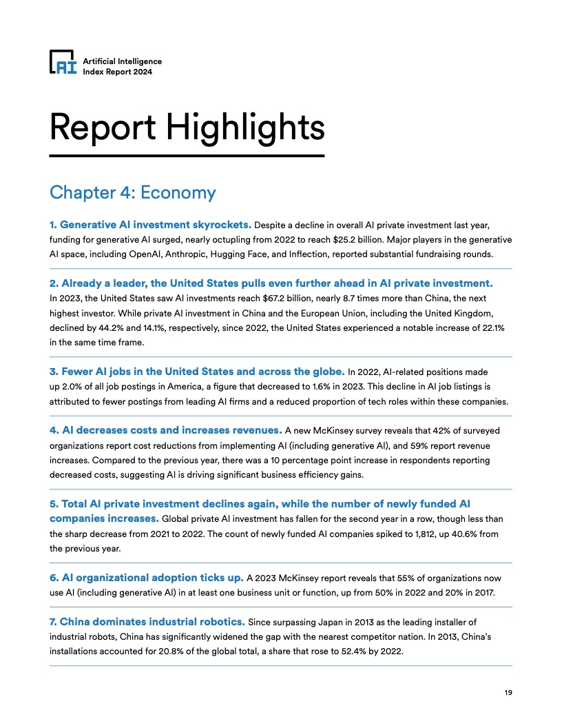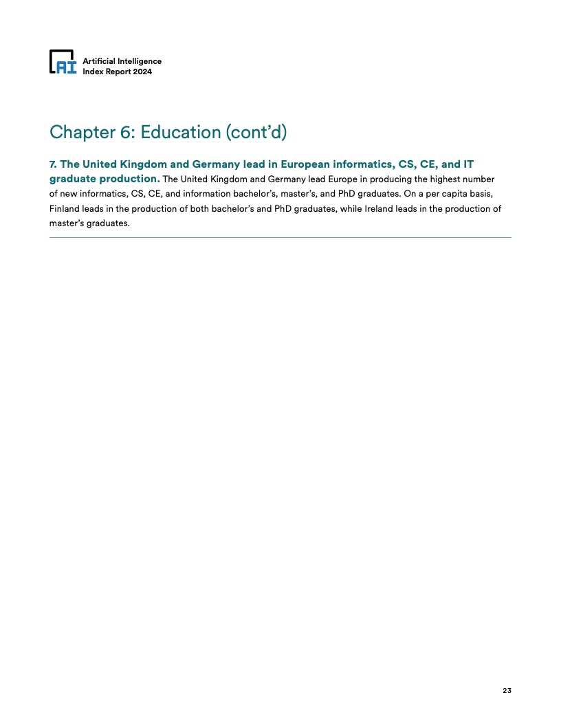 美国在顶级 AI 模型的研发方面处于领先地位。2023 年有 61 个重要的 AI 模型来自美国机构,远远超过了欧盟的 21 个。