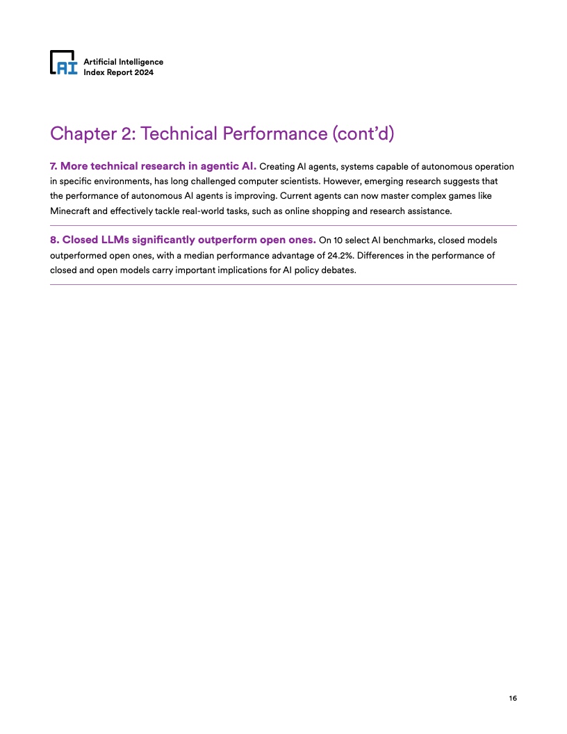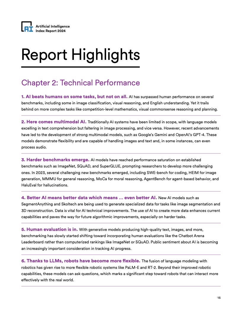 AI 在某些任务上已经超越了人类,例如图像识别、视觉推理和英语理解等领域,但在一些更复杂的任务上,例如高水平数学竞赛、视觉常识推理和规划等,AI 的表现仍然落后于人类。