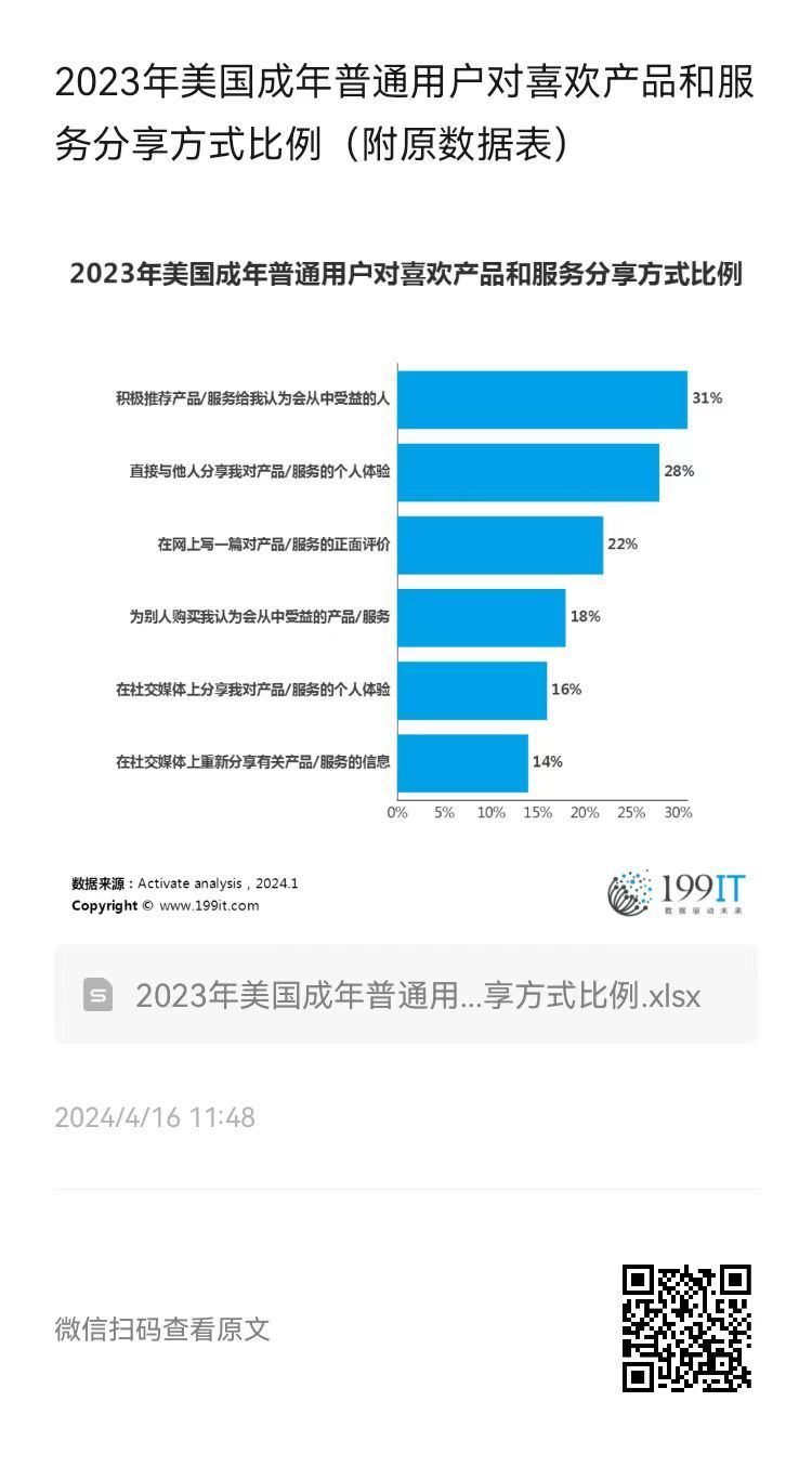 2023年美国成年普通用户对喜欢产品和服务分享方式比例(附原数据表) ​​​