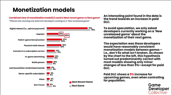 随着对实时服务的担忧增长,开发者似乎对旧的付费 DLC 模式的兴趣有所上升。30% 的受调查开发者表示他们的下一款游戏正在尝试该模式,这比最近发布的游戏增长了9%。