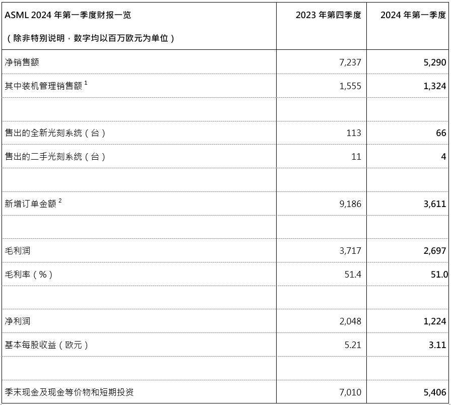 ASML(阿斯麦)近日公布了2024年第一季度财报,当季实现净销售额52.90亿欧元(约合人民币406.5亿元),环比下滑26.9%;毛利率51.0%,环比减少0.4个百分点;净利润12.24亿欧元(约合人民币94.1亿元),环比下滑40.2%。