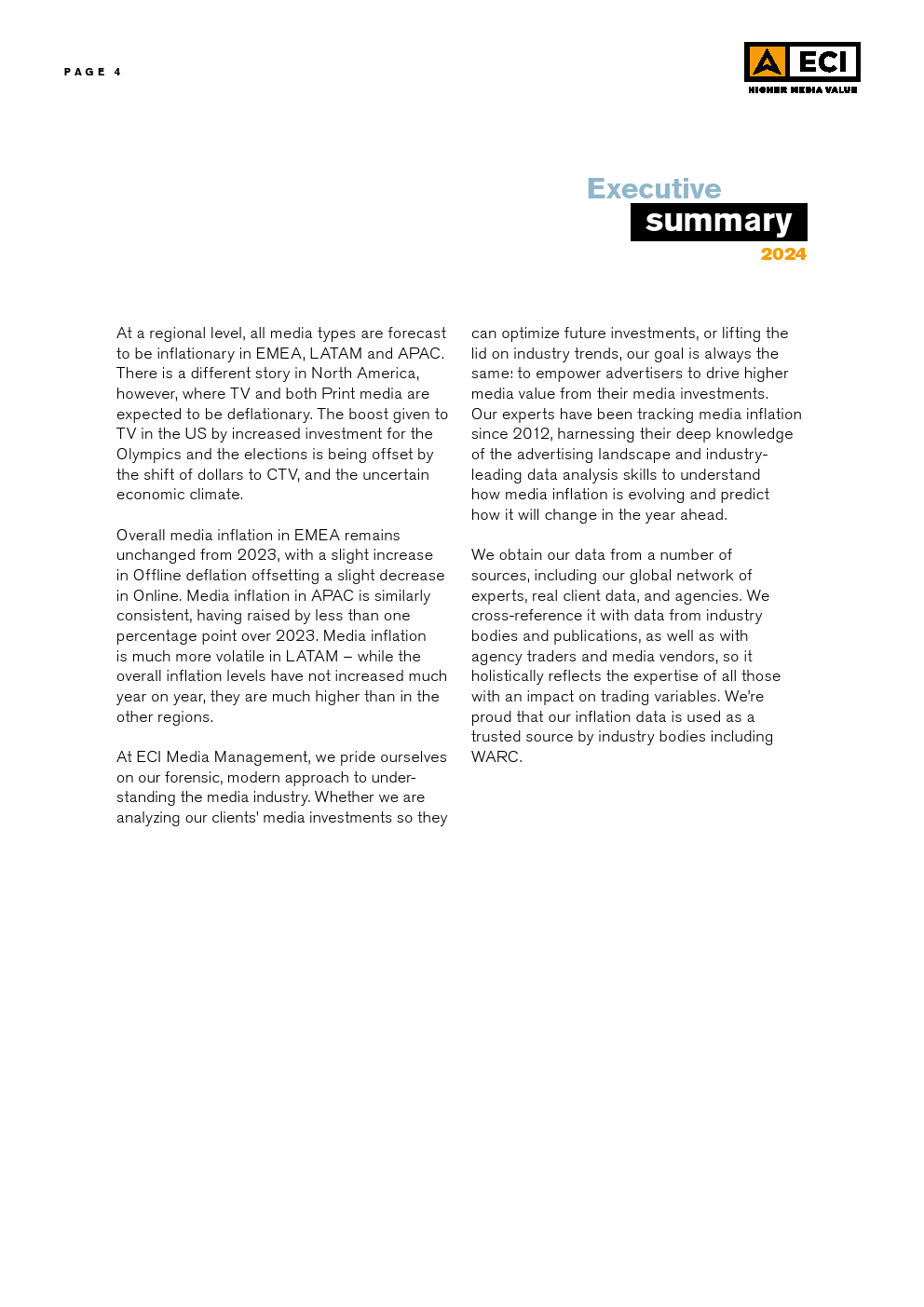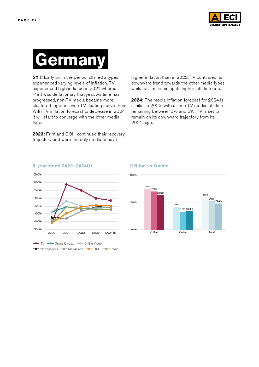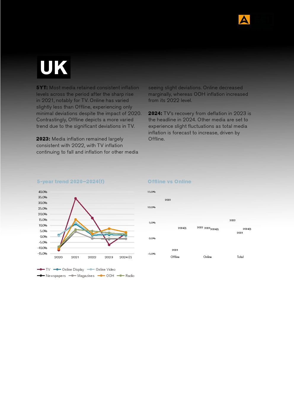 EMEA的整体媒体通货膨胀率与2023年相比保持不变,线下通货膨胀率的小幅上升抵消了在线通货膨胀率的小幅下降。亚太地区的媒体通胀也保持一致,与2023年相比上升了不到一个百分点。拉美地区的媒体通胀更加不稳定,尽管总体通胀水平同比没有大幅上升,但却远高于其他地区。
