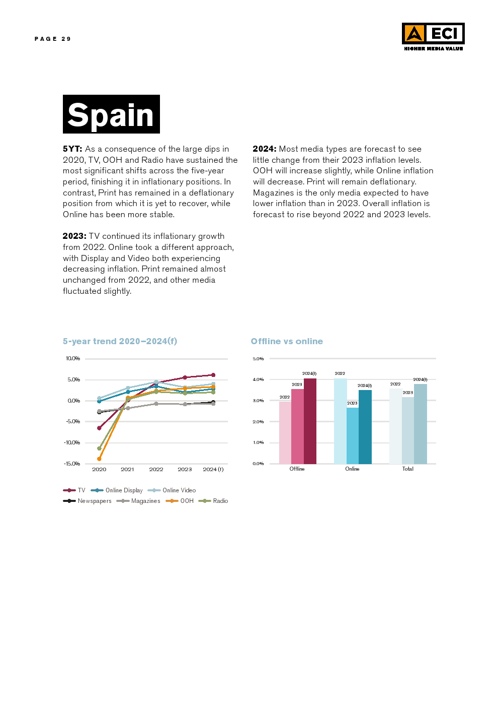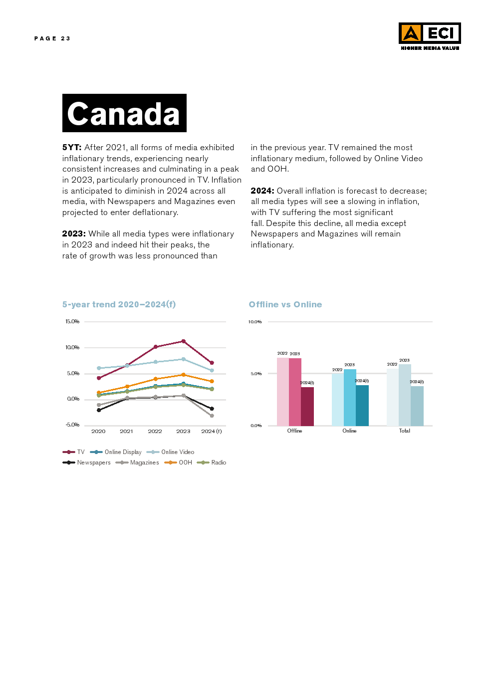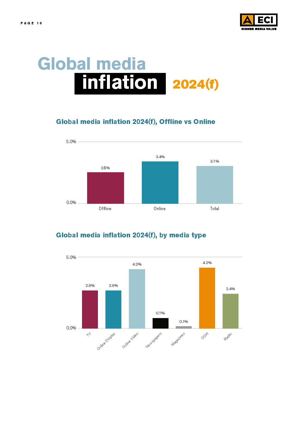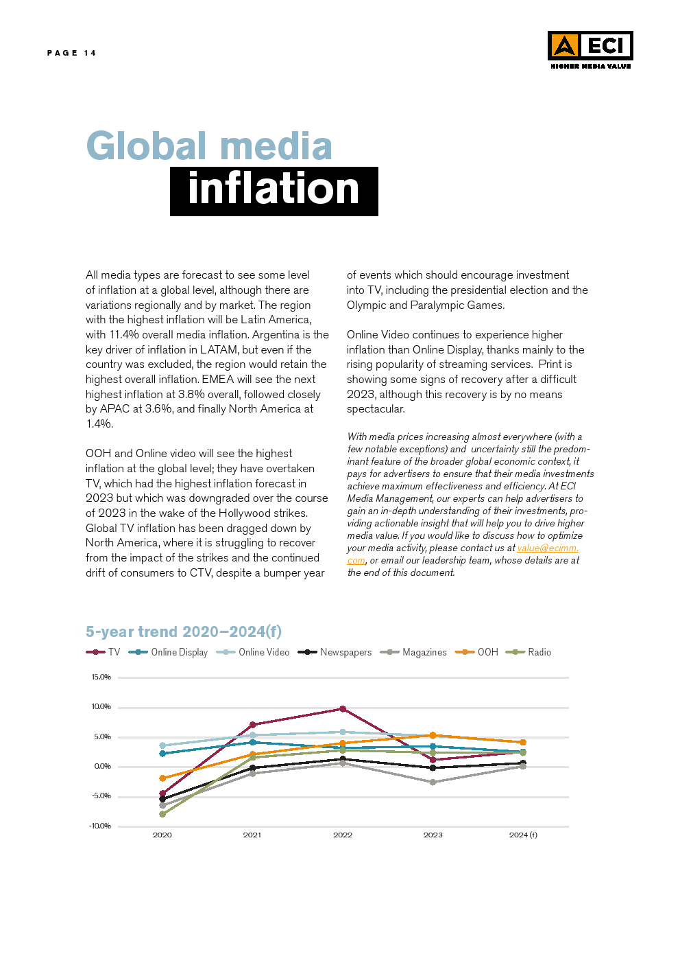 ECl预测,2024年全球媒体的总体通货膨胀率将为3.1%,略低于2023年,而2023年又明显低于2022年。这种放缓可能是挑战环境的一个迹象。尽管在区域和市场层面上存在差异,但预计所有媒体类型在全球范围内都会出现一定程度的通货膨胀。预计户外媒体和在线视频将在全球范围内拥有最高的通货膨胀率,超过电视,后者在2023年初的预测最高,但在今年被下调。
