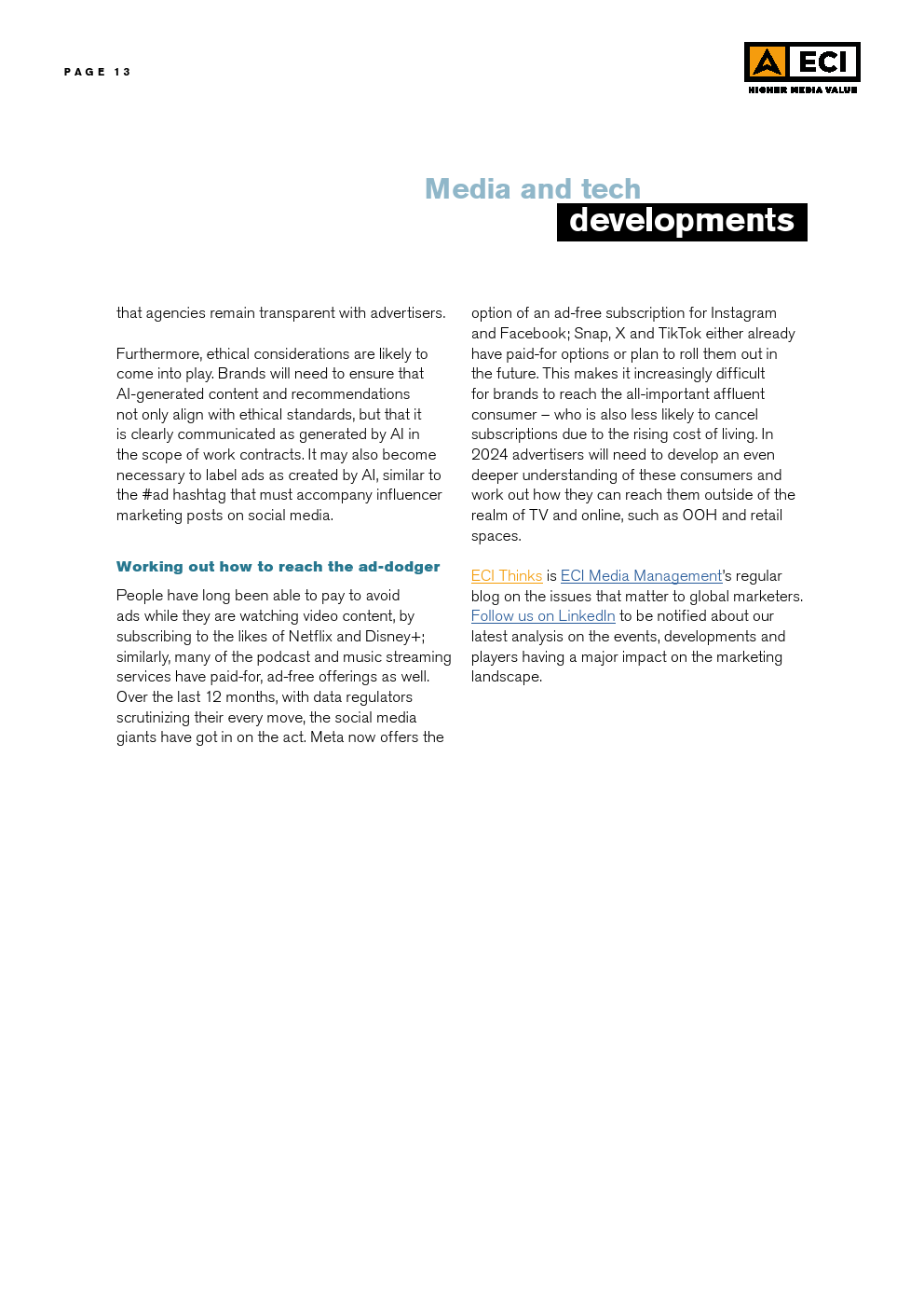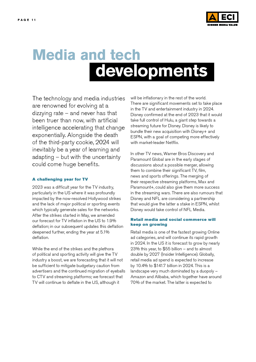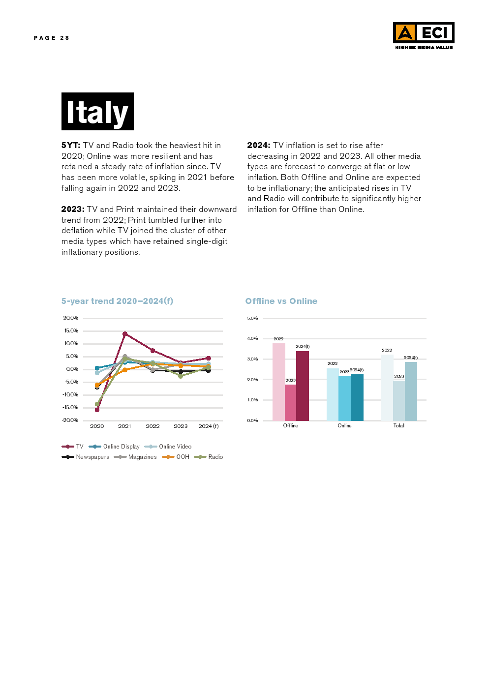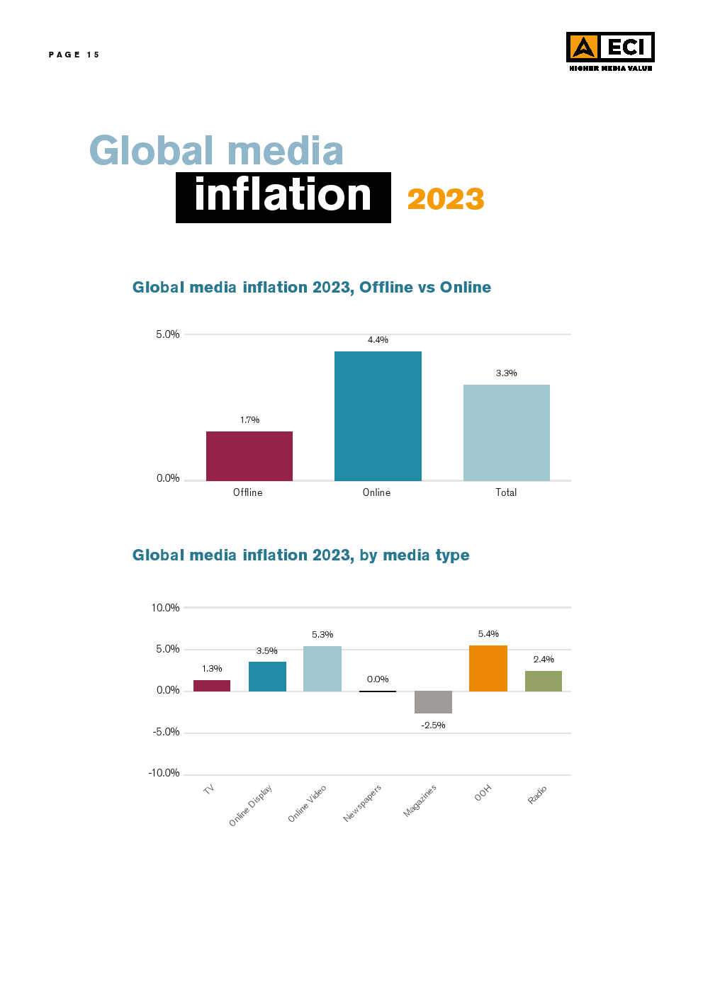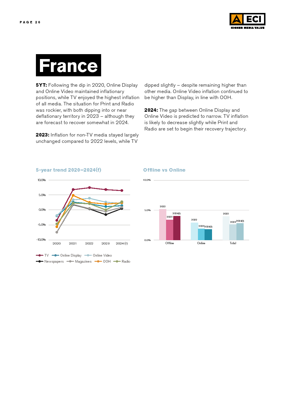 ECl预测,2024年全球媒体的总体通货膨胀率将为3.1%,略低于2023年,而2023年又明显低于2022年。这种放缓可能是挑战环境的一个迹象。尽管在区域和市场层面上存在差异,但预计所有媒体类型在全球范围内都会出现一定程度的通货膨胀。预计户外媒体和在线视频将在全球范围内拥有最高的通货膨胀率,超过电视,后者在2023年初的预测最高,但在今年被下调。