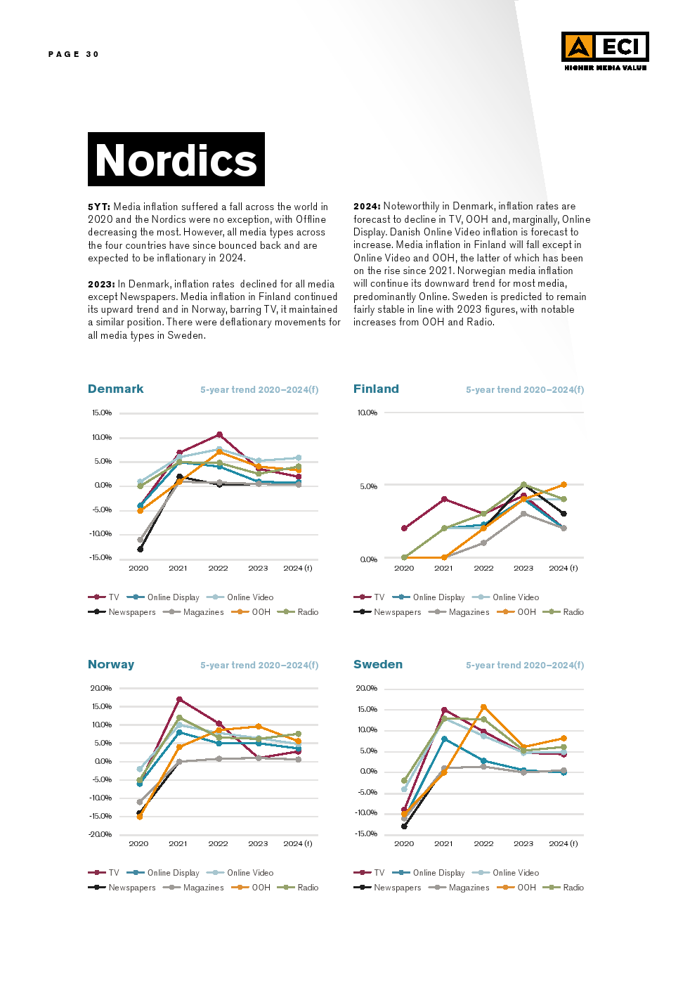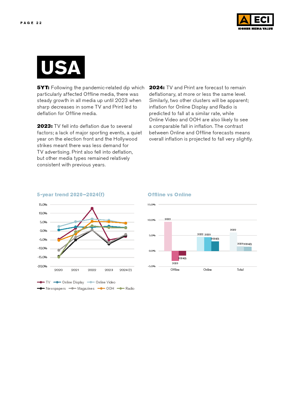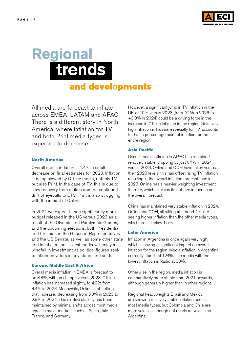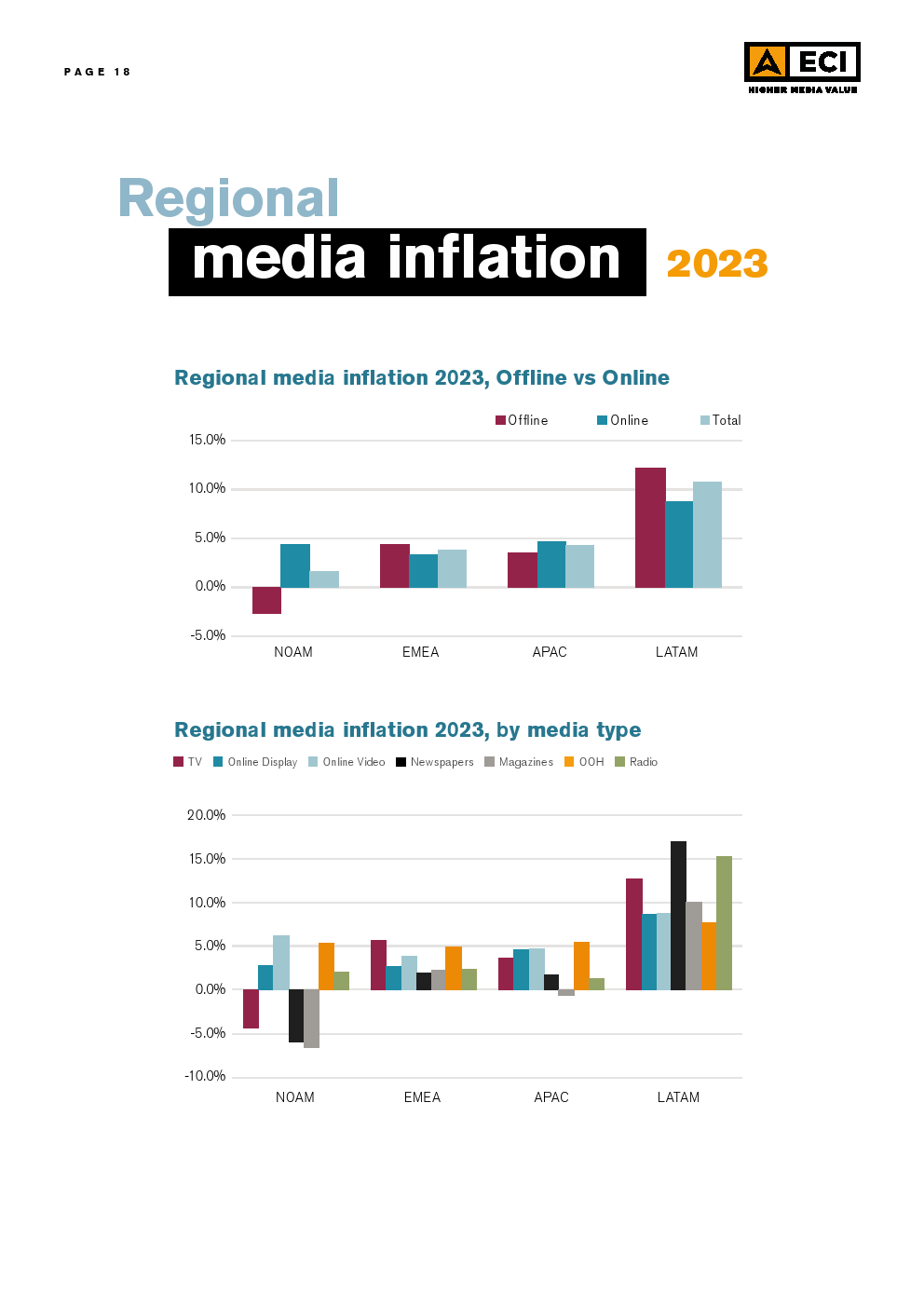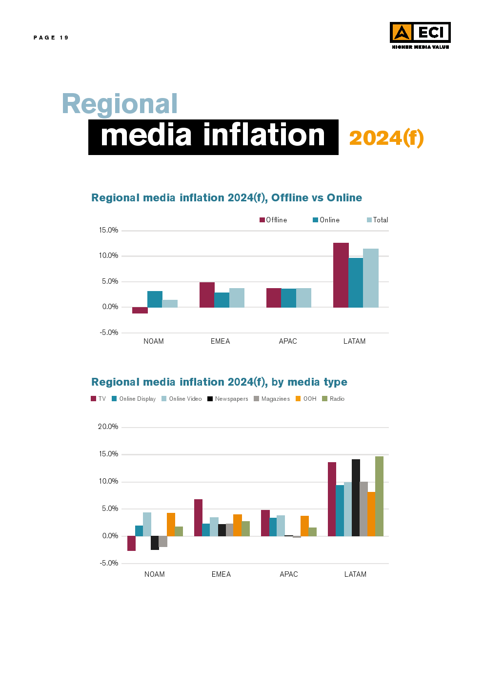在区域层面上,预计EMEA、拉丁美洲和亚太地区的所有媒体类型都将出现通货膨胀。北美的情况却截然不同,那里的电视和两种印刷媒体预计将出现通缩。