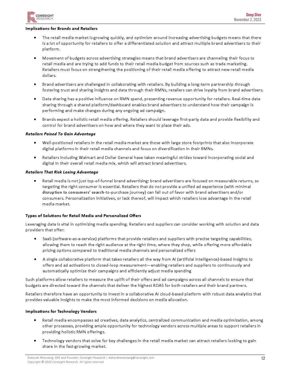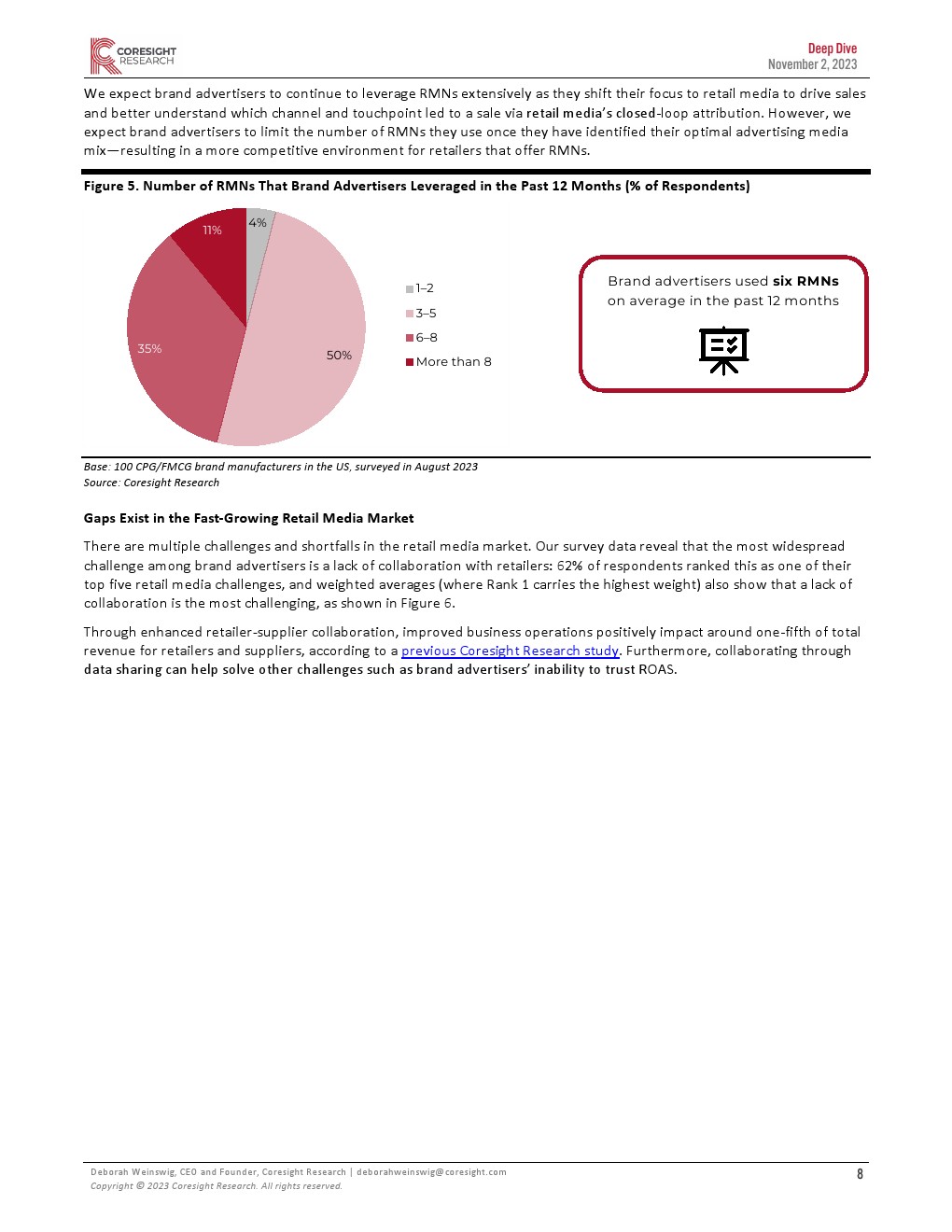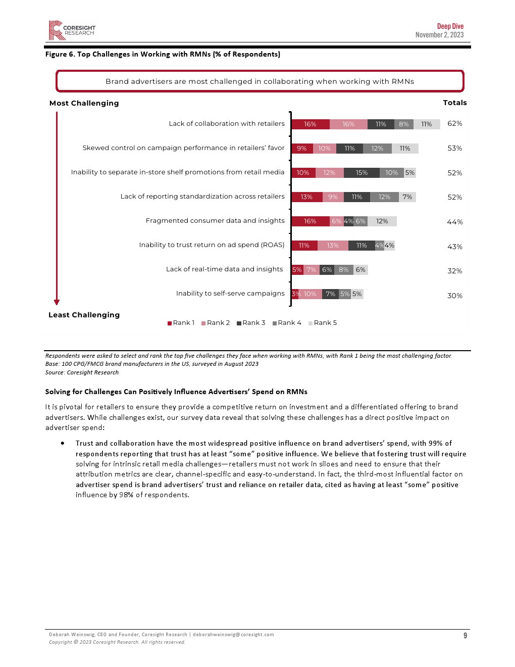 在RMN方面,品牌广告主面临的最普遍挑战是缺乏与零售商的合作。加强合作可以对零售商和供应商的收入产生积极影响,改进数据共享可以帮助解决品牌广告主无法了解广告支出回报率(ROAS)和目标受众可见性有限等挑战。