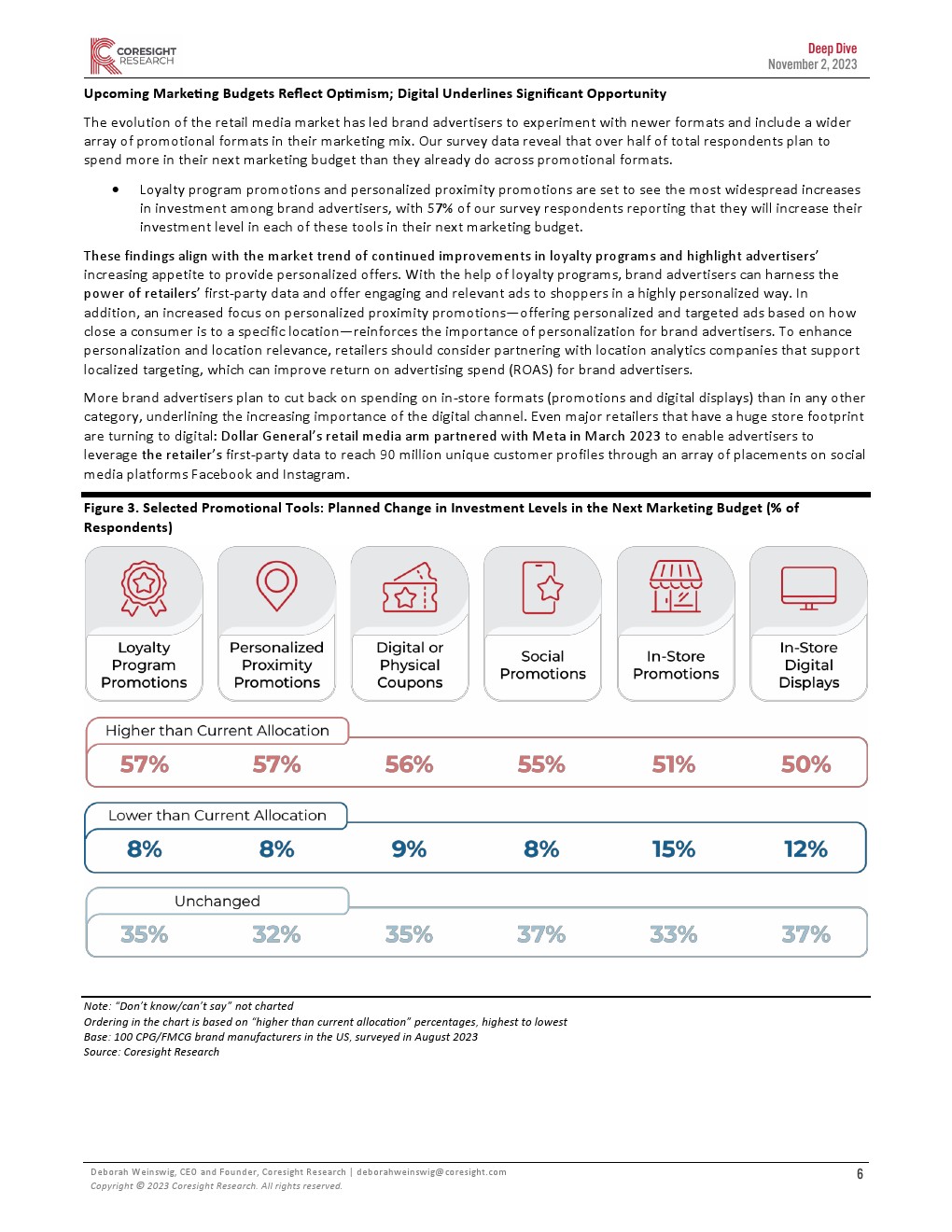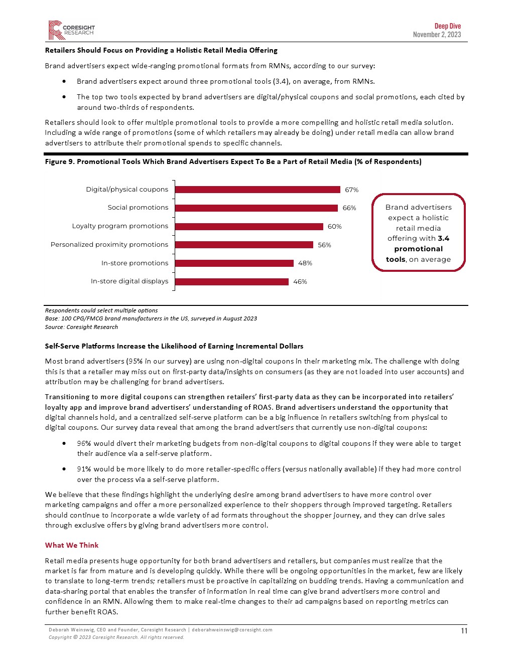 调查发现,品牌广告主期望整体零售媒体提供平均3.4个促销工具。品牌广告主最期待的两种工具是数字/实体优惠券和社交促销,约2/3的受访者提到了这两种工具。
