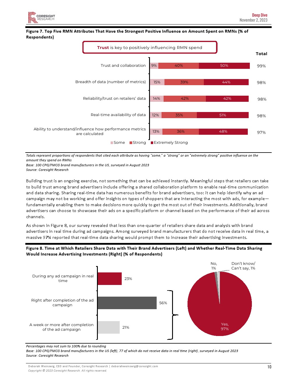 调查显示,在广告活动期间,只有不到1/4的零售商与品牌广告主实时分享数据和分析。在没有实时接收数据的受访品牌制造商中多达97%表示,实时数据共享将促使他们增加广告投资。