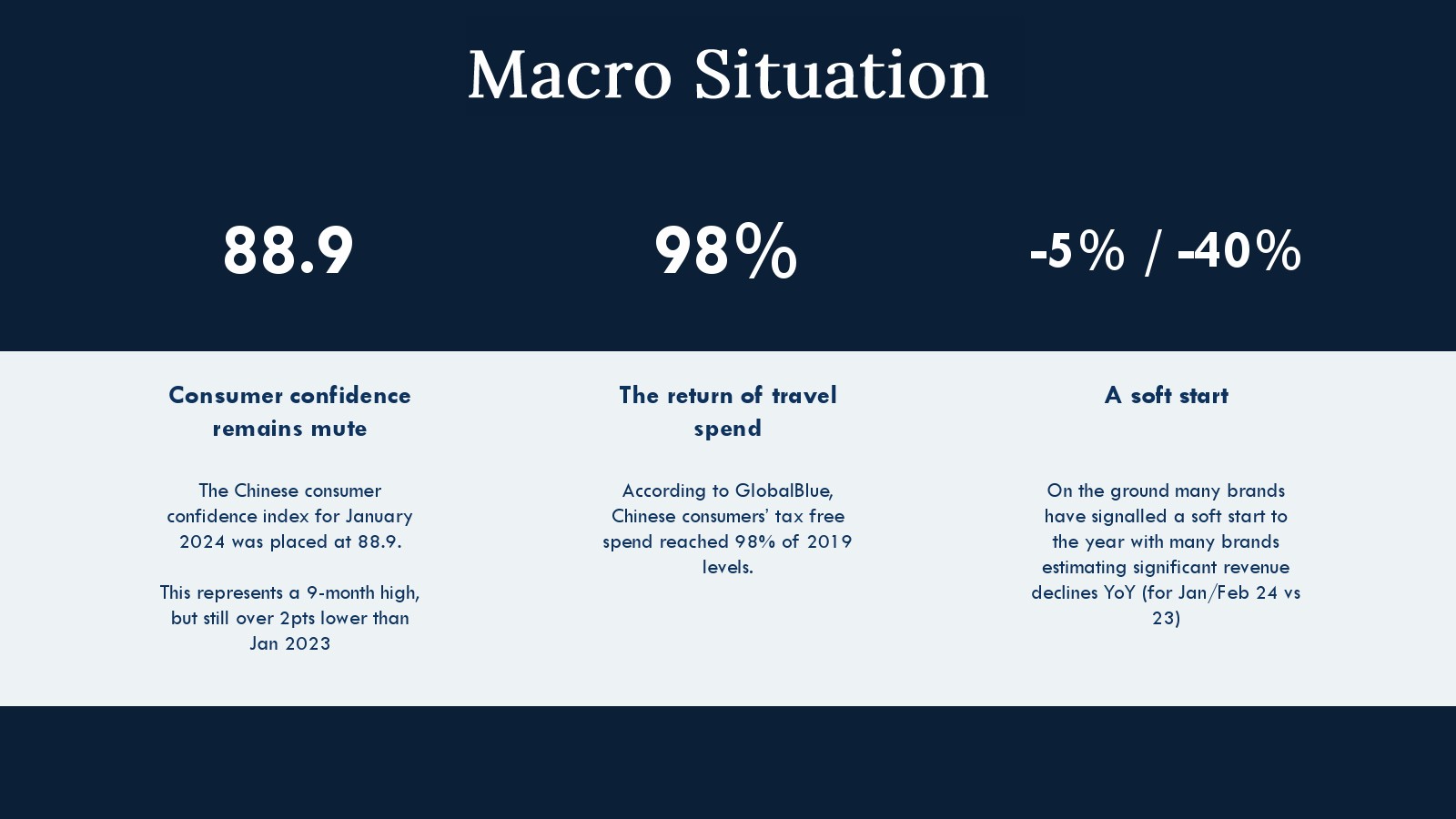 软启动。实际上,许多品牌都表示今年开局疲软,许多品牌估计收入同比大幅下降-5% / -40%(1月至2月,与23年相比)。