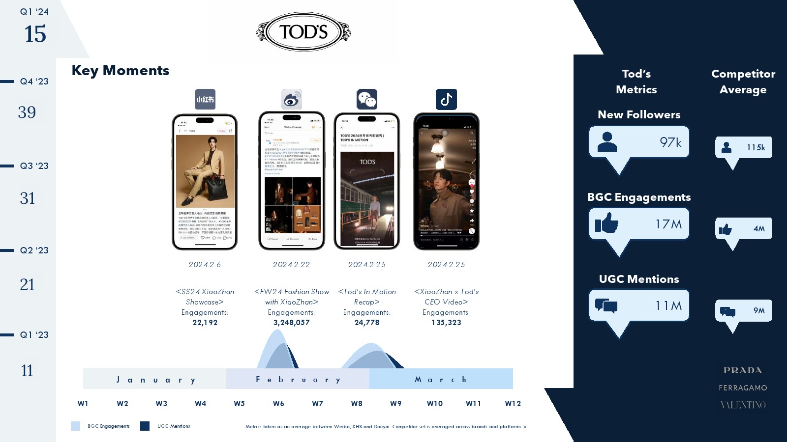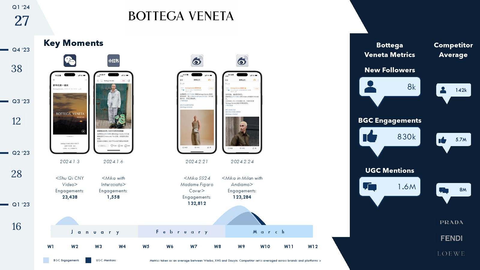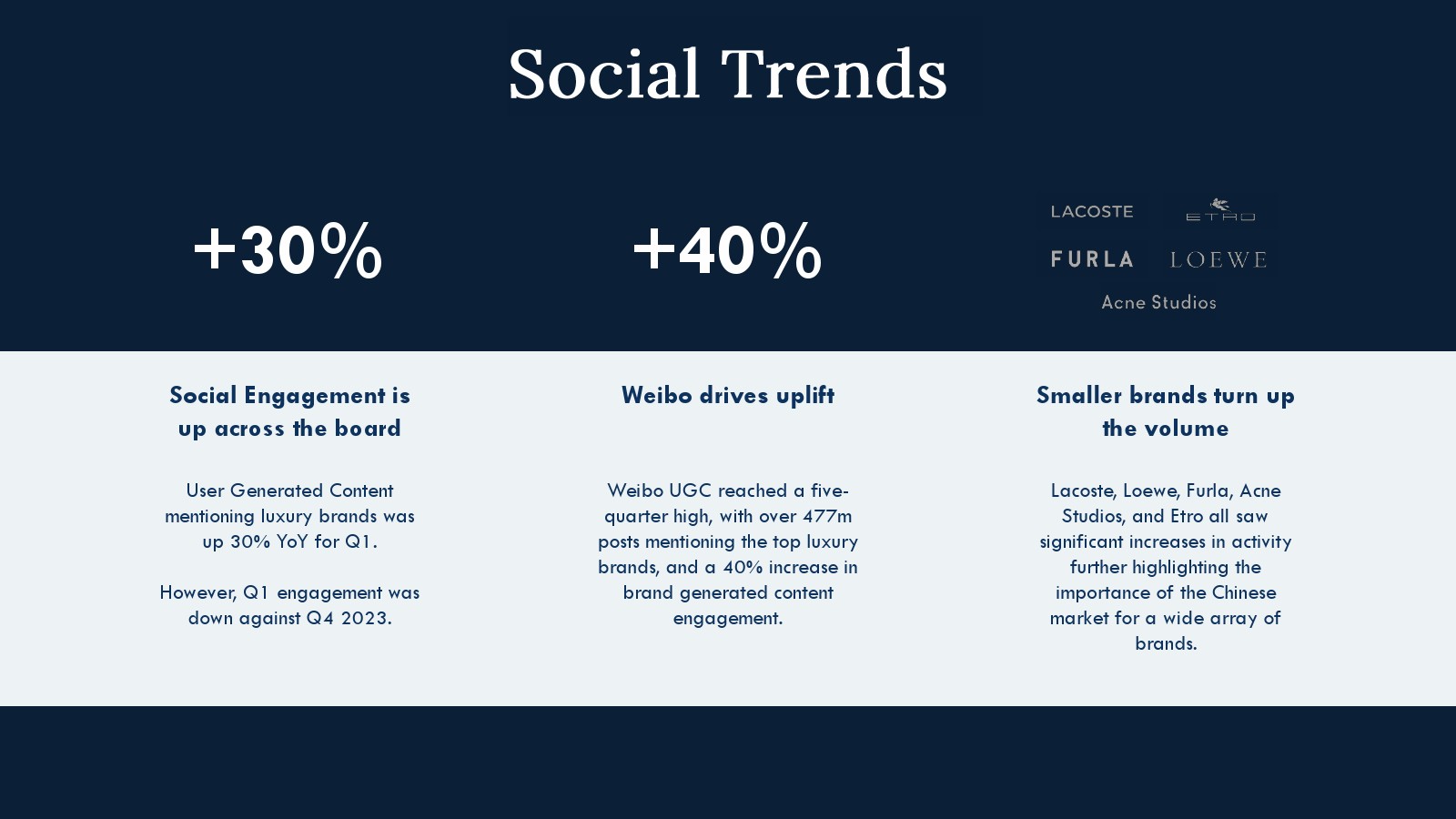 社交参与度全面提升。第一季度,提及奢侈品牌的用户生成内容同比增长30%。与2023年第四季度相比,第一季度的参与度有所下降。
