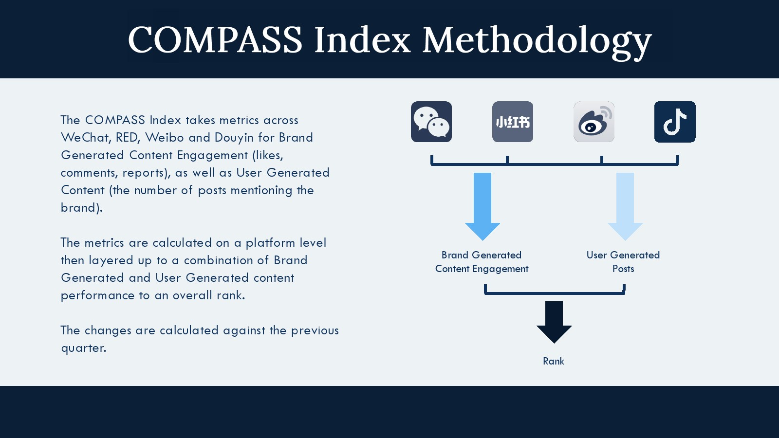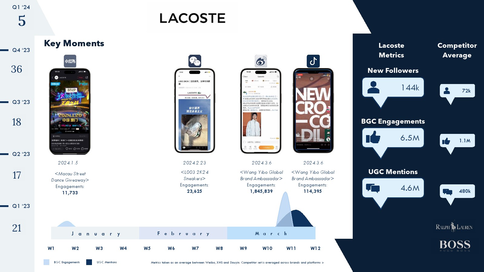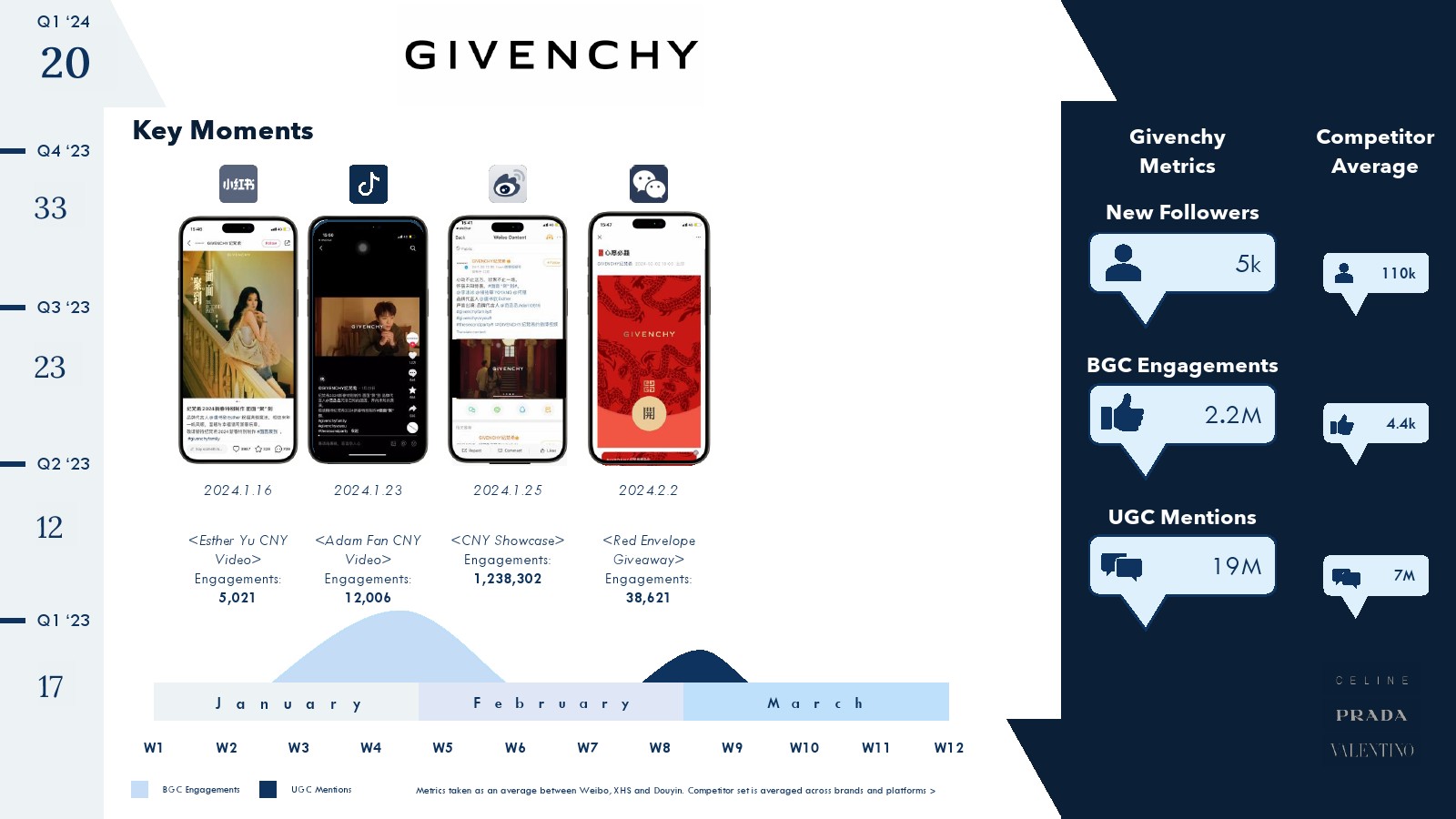 微博带动上升。微博用户生成内容达到了五个季度以来的最高水平,超过4.77亿条微博提到了顶级奢侈品牌,品牌生成内容的参与度增长了40%。