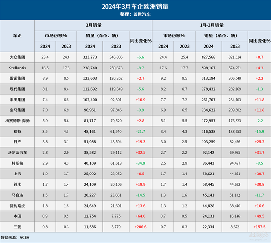 从车企来看,3月份,大众汽车集团、Stellantis和雷诺集团仍然是欧洲最畅销的汽车制造商,但大众汽车集团和Stellantis当月在欧洲的销量分别同比下滑6.6%和8.7%,雷诺集团则实现了2.7%的同比增长。