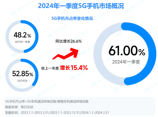 5G 智能手机市场持续升温。日前,工信部数据显示,一季度中国 5G 手机出货量达 5643 万部,同期占比 83.7%。每日互动大数据持续关注国内智能手机市场,通过对智能手机激活设备数进行统计分析,从使用的角度反映市场变迁。每日互动大数据洞察发现,截至今年一季度,5G 手机占比 61%,同比增长 26.6%,较 2023 年末增长 15.4%。5G 智能手机市场 “春意浓”。