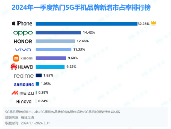 综观国内一季度 5G 手机市场,iPhone 涨幅收窄释放更多行业空间,除竞争激烈的一众头部品牌外,AI 技术创新或将成为小众品牌搅动市场格局的重要变量。我们共同期待,经过 “金三银四” 的上新旺季,国内智能手机市场能够呈现怎样的增长活力,每日互动大数据也将为您持续关注。