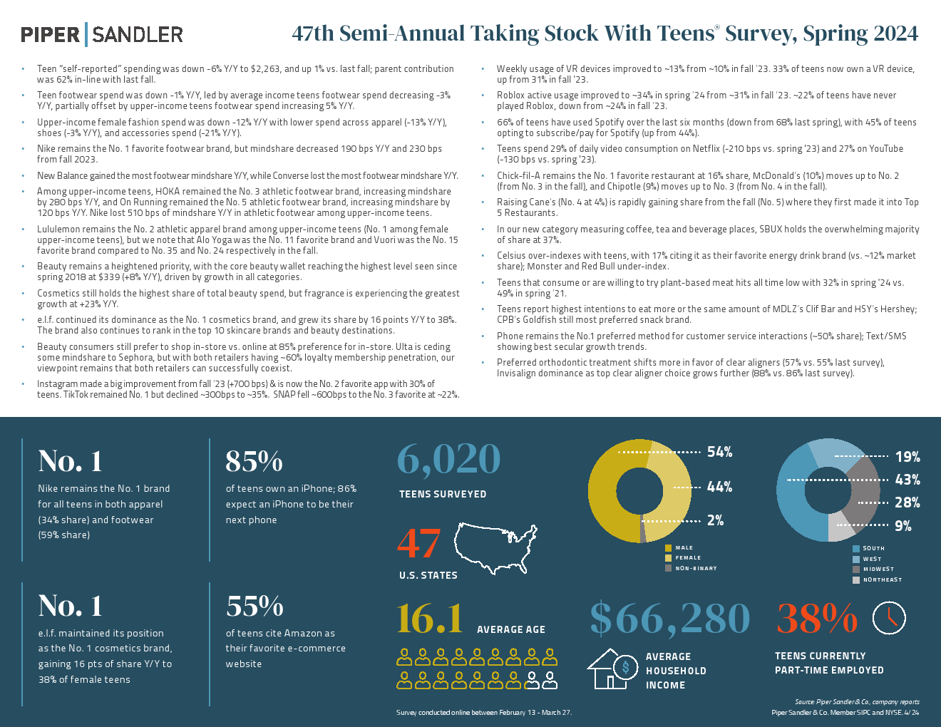 青少年“自我报告”的支出同比下降6%,达到2263美元,较去年秋季增长1%;家长出资比例为62%,与去年秋季持平。