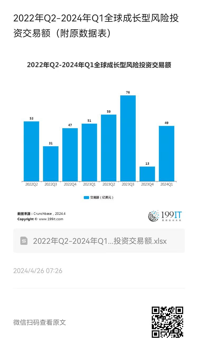 2022年Q2-2024年Q1全球成长型风险投资交易额(附原数据表) ​​​