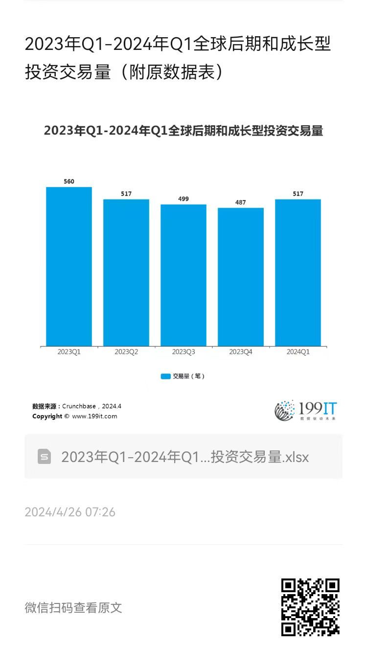 - 2023年Q1-2024年Q1全球后期和成长型投资交易额(附原数据表)