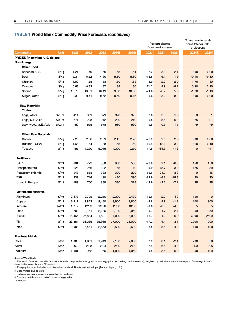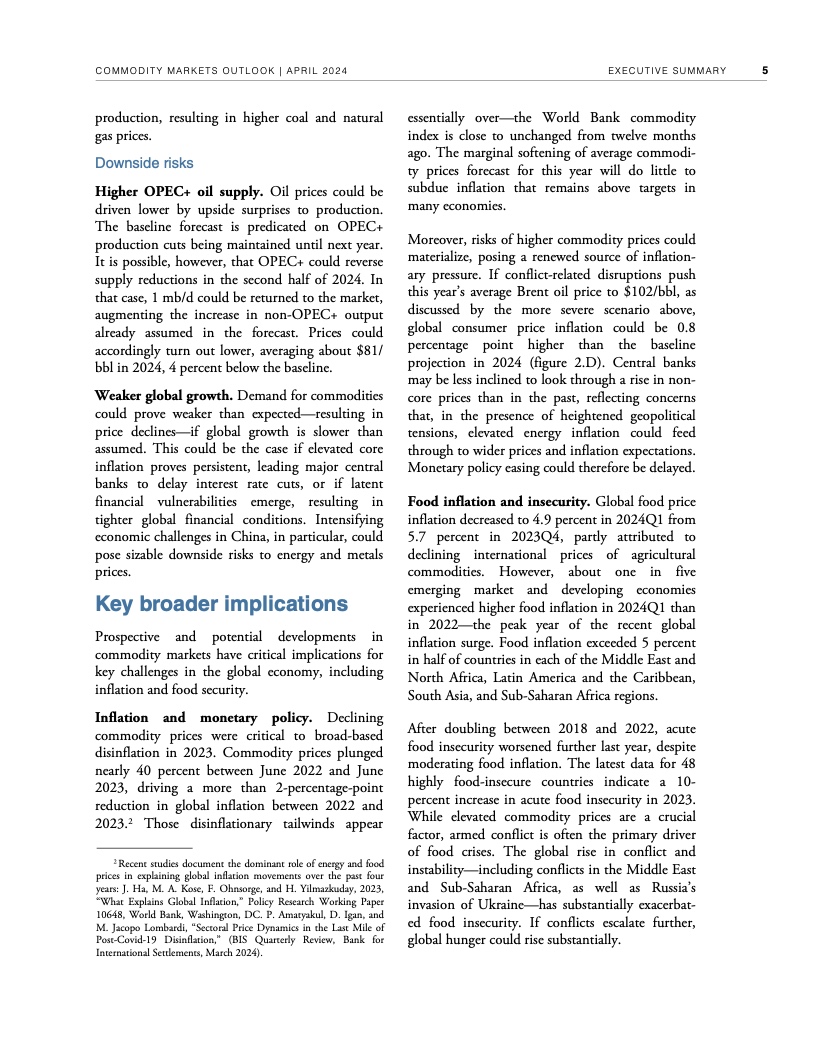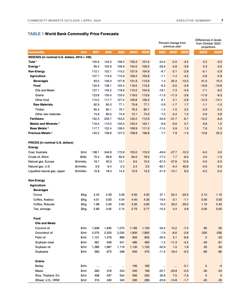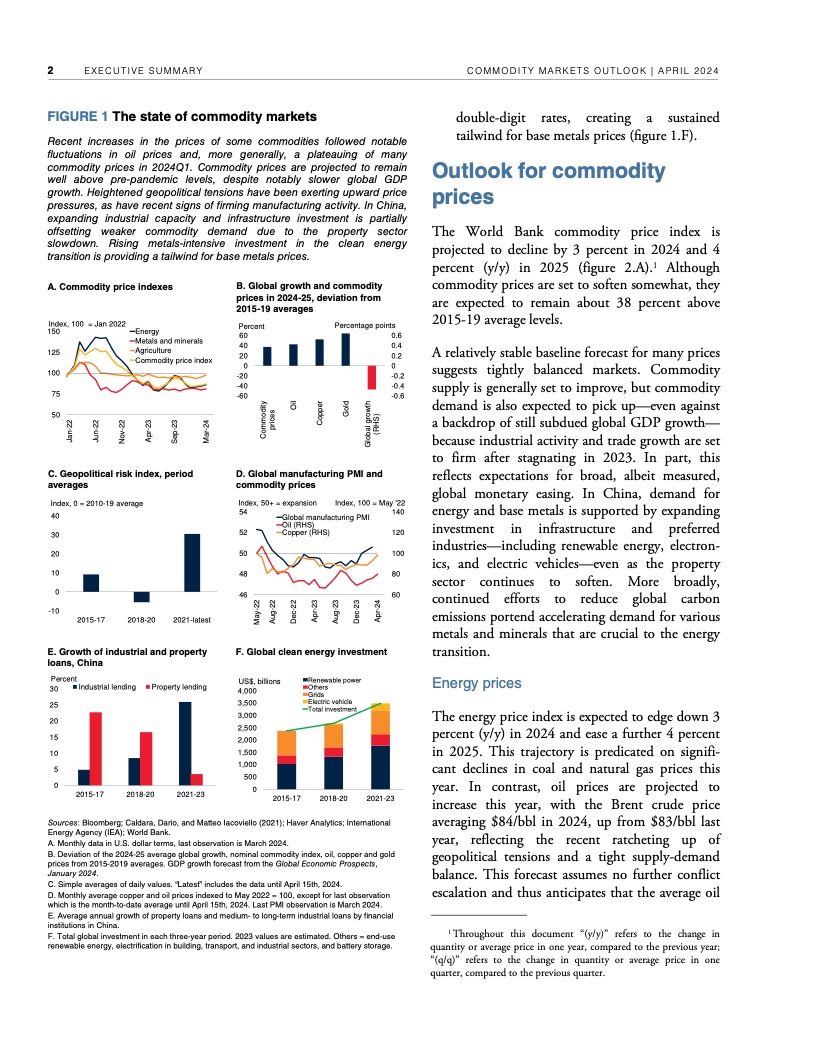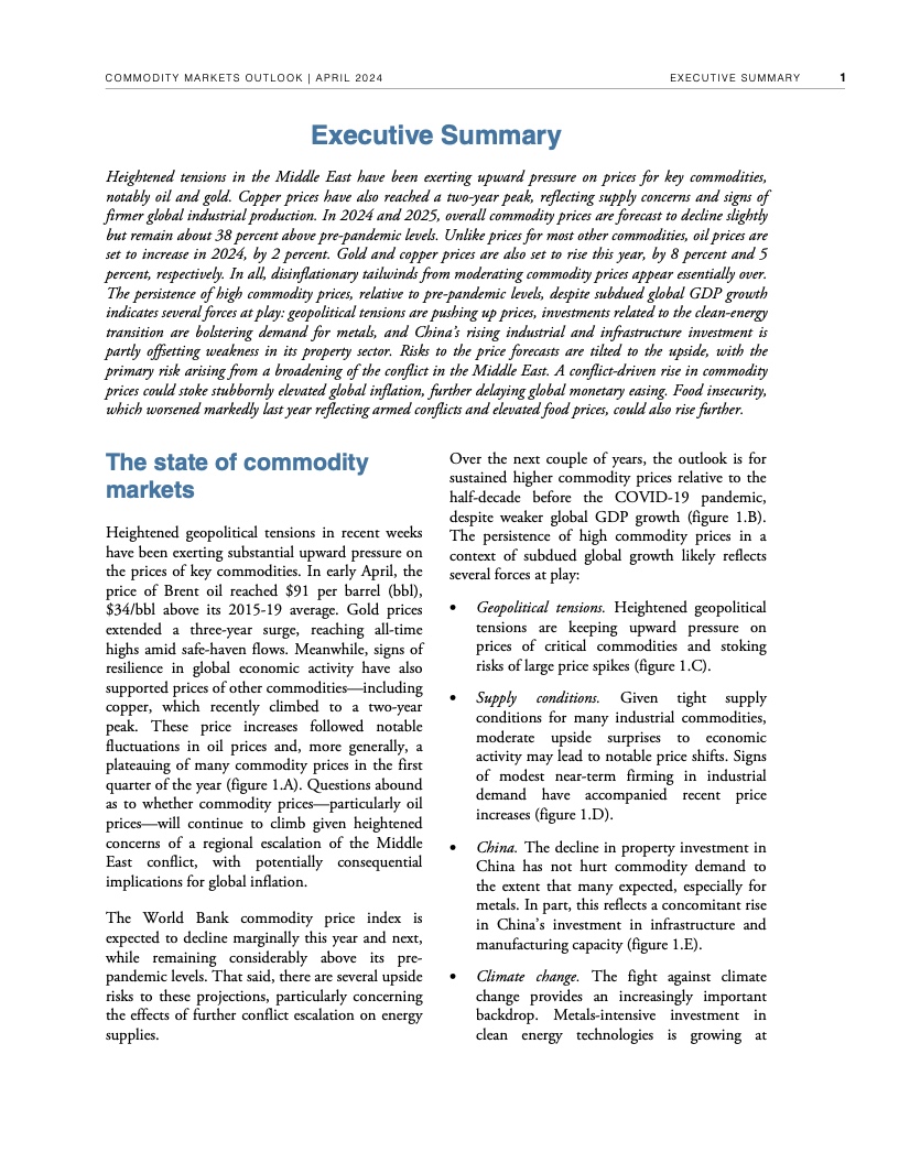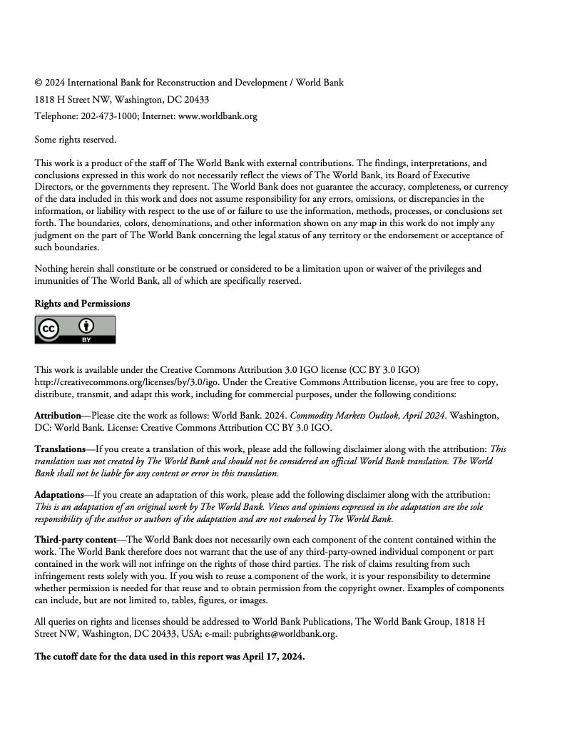2022年年中至2023年年中,全球大宗商品价格暴跌近40%,帮助推动2022年、2023年全球通胀率降低了约2个百分点。不过,自2023年年中以来,世行大宗商品价格指数基本没有变化。假定地缘政治紧张局势不再升级,世行预测2024年全球大宗商品价格将下降3%,2025年下降4%。这种降幅对于抑制大多数国家仍高于央行目标的通货膨胀几乎无济于事,大宗商品价格也依然比新冠疫情前五年的平均水平高出约38%。