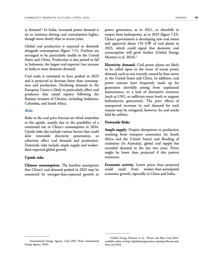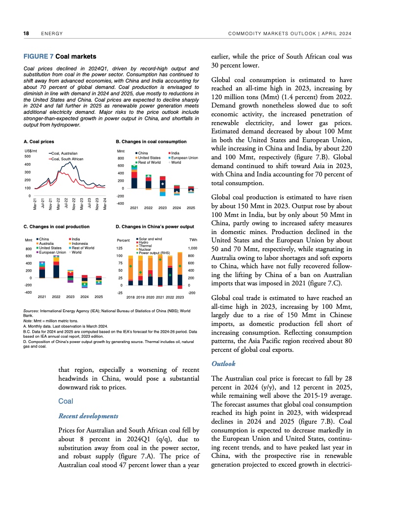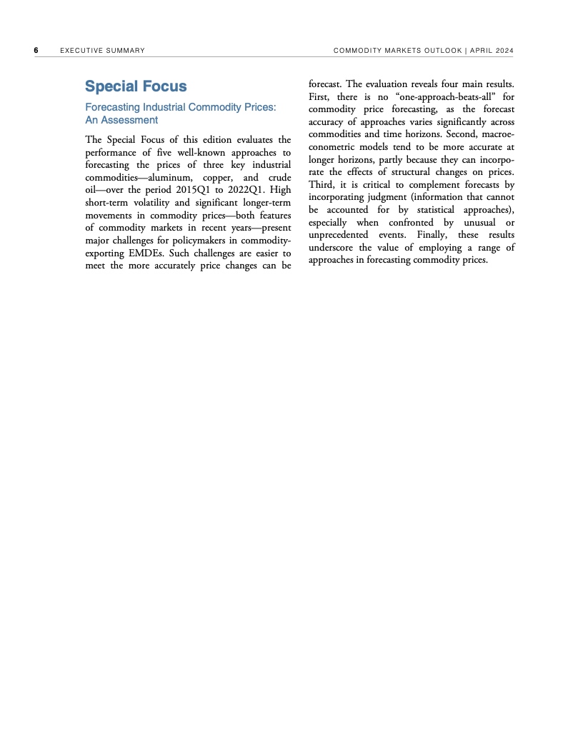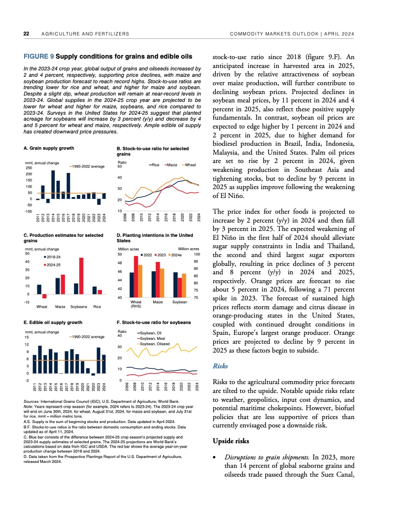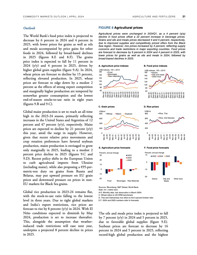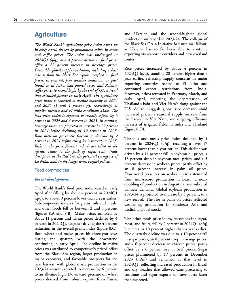 2022年年中至2023年年中,全球大宗商品价格暴跌近40%,帮助推动2022年、2023年全球通胀率降低了约2个百分点。不过,自2023年年中以来,世行大宗商品价格指数基本没有变化。假定地缘政治紧张局势不再升级,世行预测2024年全球大宗商品价格将下降3%,2025年下降4%。这种降幅对于抑制大多数国家仍高于央行目标的通货膨胀几乎无济于事,大宗商品价格也依然比新冠疫情前五年的平均水平高出约38%。