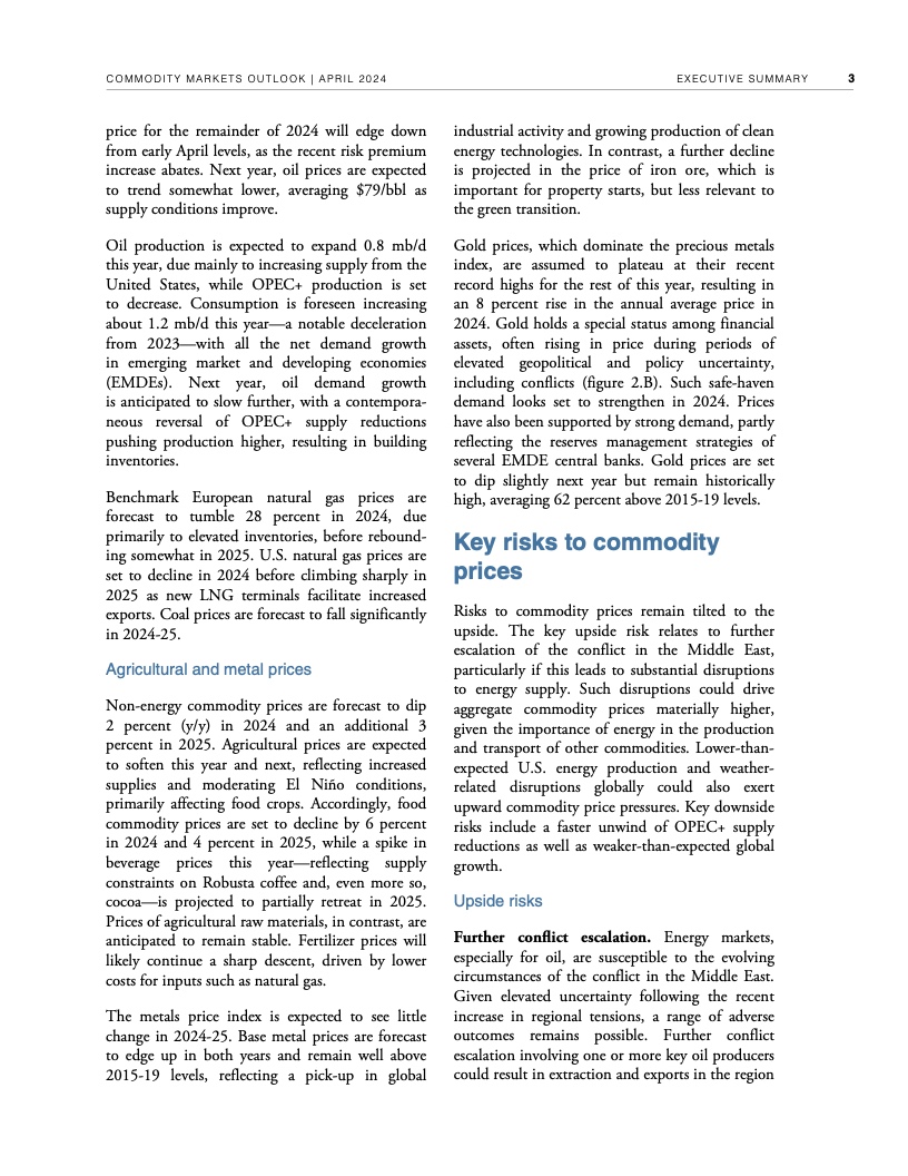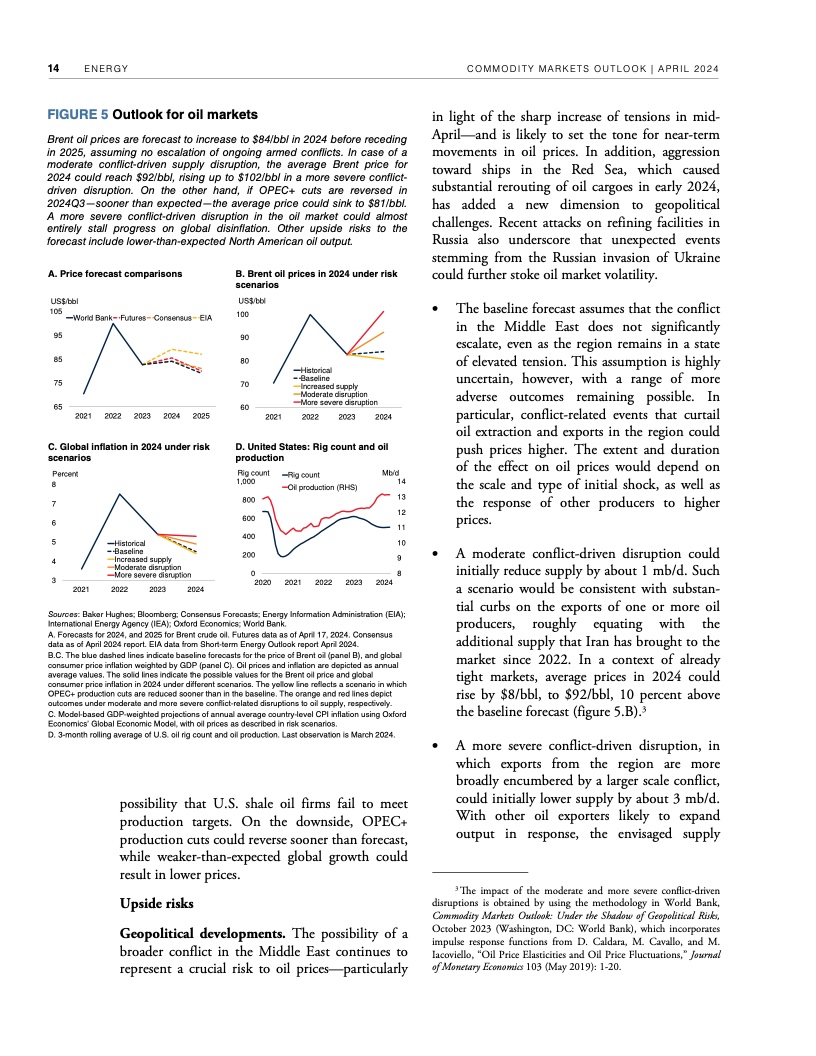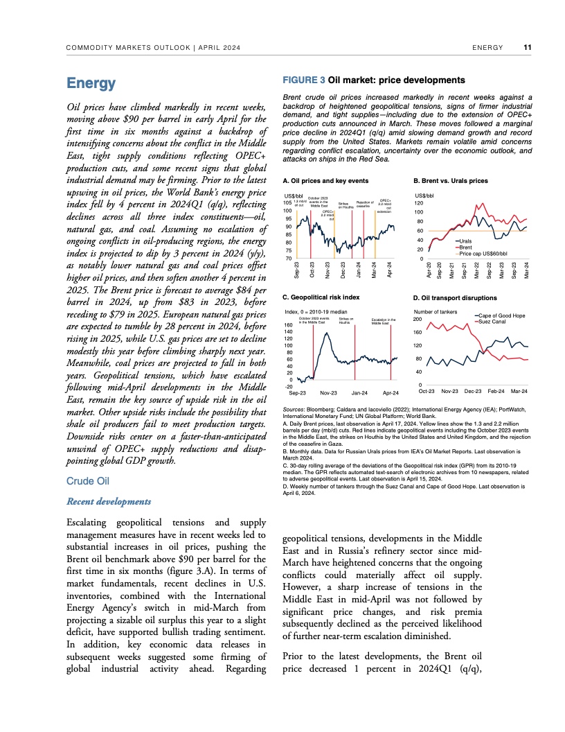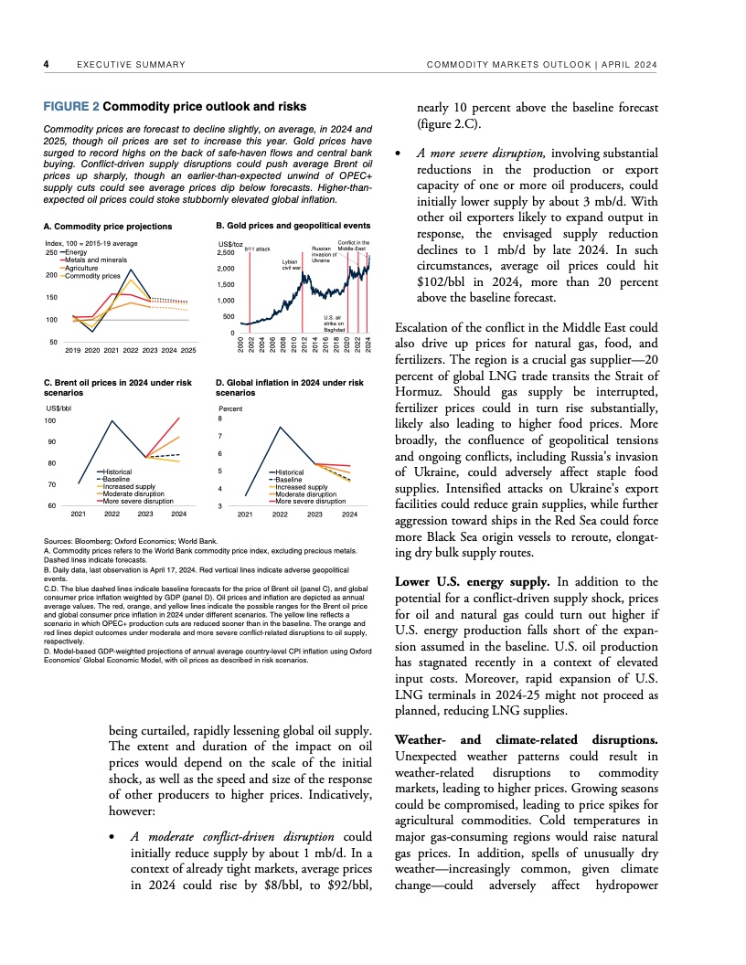 过去两年,尽管全球经济增长放缓,但持续的地缘政治紧张局势支撑了原油等许多主要大宗商品的价格。例如,本月早些时候,布伦特原油价格飙升至每桶91美元,比2015-2019年平均价格高出近34美元。据世界银行预测,如果不发生冲突造成的供应中断,2024年布伦特原油价格将维持在平均每桶84美元,2025年将跌至平均每桶79美元。中东局势进一步调整优化,石油供应中断可能推高全球通胀。如果冲突引发适度的供应中断,布伦特原油价格今年可能上涨至平均每桶92美元。如果中断严重,可能会将油价推高至每桶100美元以上,从而造成2024年全球通胀率上升近一个百分点。