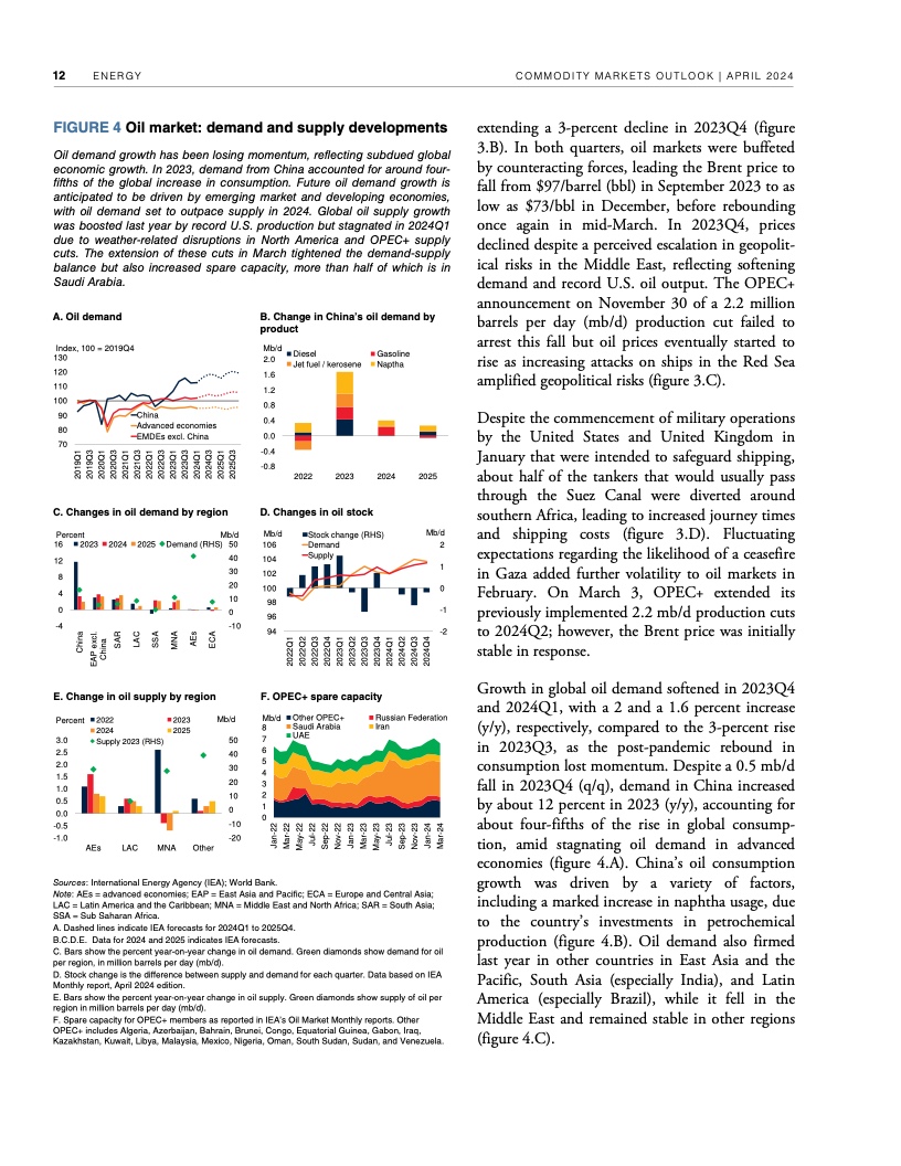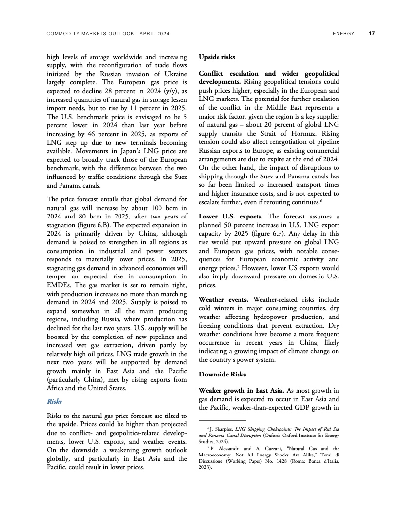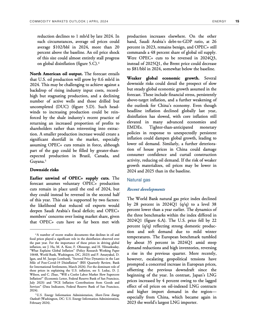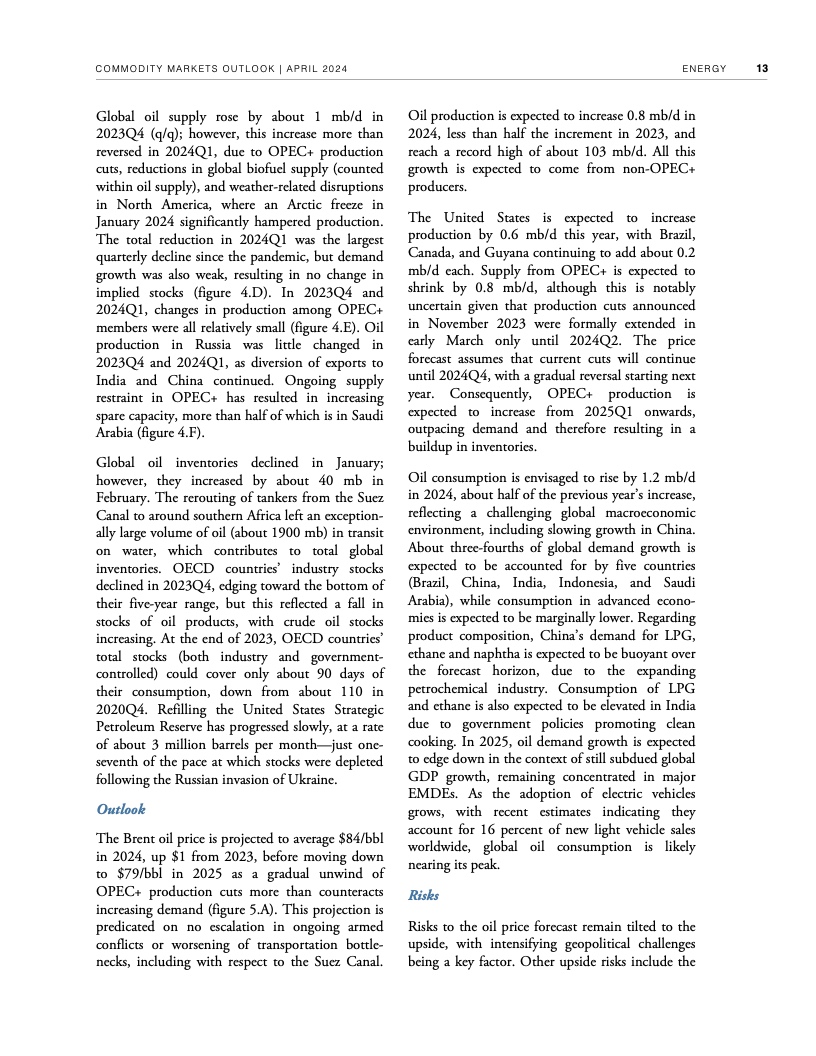 过去两年,尽管全球经济增长放缓,但持续的地缘政治紧张局势支撑了原油等许多主要大宗商品的价格。例如,本月早些时候,布伦特原油价格飙升至每桶91美元,比2015-2019年平均价格高出近34美元。据世界银行预测,如果不发生冲突造成的供应中断,2024年布伦特原油价格将维持在平均每桶84美元,2025年将跌至平均每桶79美元。中东局势进一步调整优化,石油供应中断可能推高全球通胀。如果冲突引发适度的供应中断,布伦特原油价格今年可能上涨至平均每桶92美元。如果中断严重,可能会将油价推高至每桶100美元以上,从而造成2024年全球通胀率上升近一个百分点。