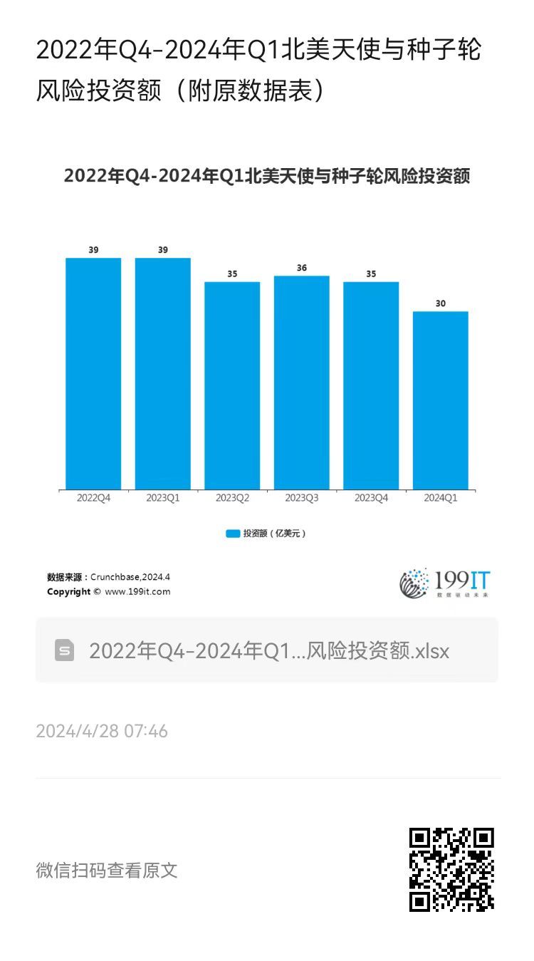 2022年Q4-2024年Q1北美天使与种子轮风险投资额(附原数据表) ​​​