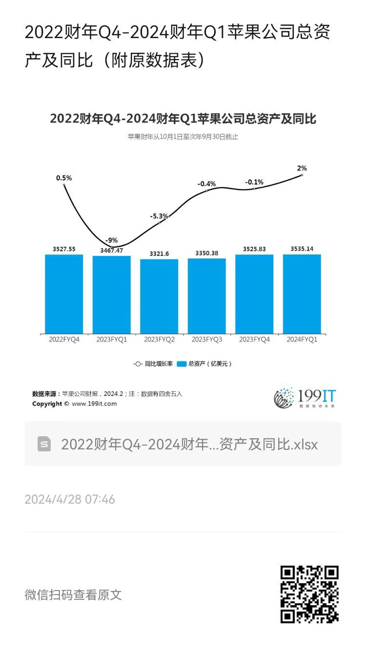 2022财年Q4-2024财年Q1苹果公司总资产及同比(附原数据表) ​​​
