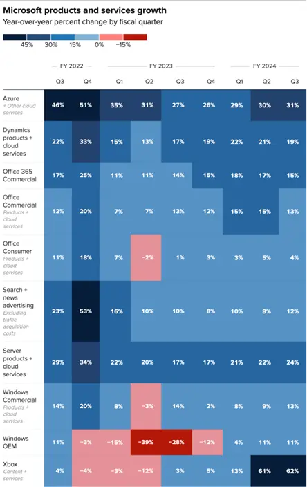 云业务方面,本季度微软云收入为351亿美元,已实现连续三个季度增长,也是本次微软财报最超预期的点。云业务是微软最大的收入驱动力,其中包括Azure计算平台。剔除货币波动的影响后,Azure的收入增长了31%,高于市场研究公司Visible Alpha 29%的增长预期。人工智能加成后,Azure在B端获得的收入增加,目前有65%以上的世界500强公司在使用使用Azure的开放AI服务。
