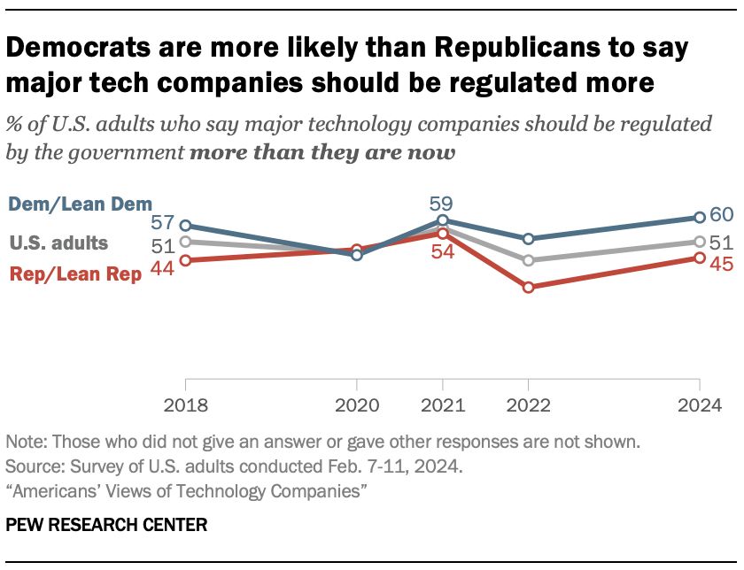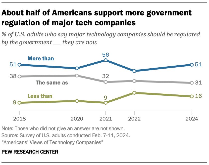 在拜登担任总统期间,联邦贸易委员会和司法部等政府机构对科技公司采取了更加严厉的措施。美国最大的几家公司,如亚马逊、苹果和Meta都面临着指控垄断行为的重大诉讼。但根据皮尤的调查,只有 16% 的美国成年人认为对科技公司的监管应该比现在少。这一比例自 2021 年以来有所增长,当时皮尤发现这一比例为 9%。