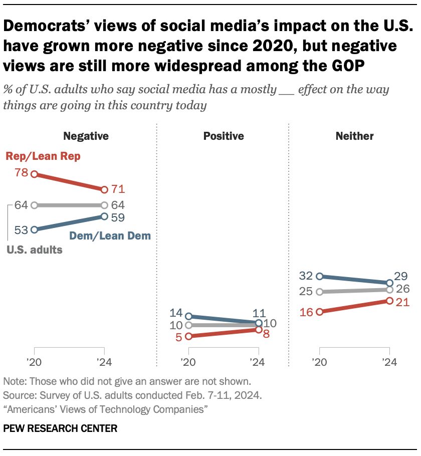 根据皮尤研究中心(Pew Research Center)的一项调查,78% 的美国成年人认为社交媒体公司对政治有太大的影响力–按党派细分,84% 的受访共和党人和 74% 的民主党人持这一观点。总体而言,自上届总统选举年以来,这一观点的受欢迎程度提高了 6%。