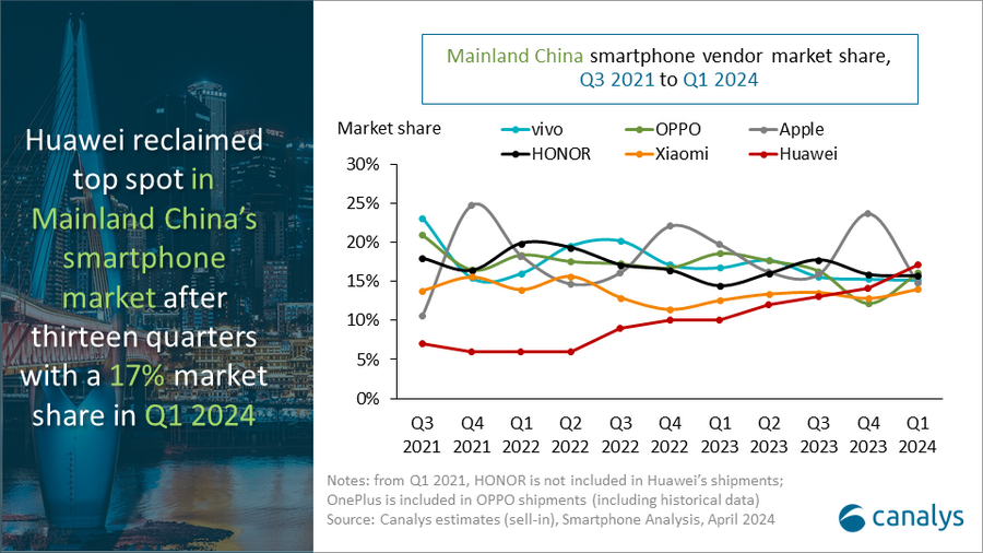Canalys高级分析师Toby Zhu表示:“中国大陆市场的增长仍然落后于全球11%的复苏,这使得华为能够迅速夺取市场份额并重新夺回桂冠。Mate 60系列的生产和供应短缺在第一季度得到改善,推动其成为华为整体增长的关键动力。除了高端产品线,华为去年12月发布了搭载Harmony 4.0的nova 12系列,将麒麟芯片组扩展到更多产品线,并成功提升了中端价格区间的性能。此前,华为还将P系列升级为Pura 70,配备了创新的弹出式镜头,进一步激起了市场的兴趣。华为2024年的一项关键战略是,专注于在系统层面为智能设备从硬件到软件构建人工智能能力,利用其在人工智能基础设施和解决方案方面的深厚研发能力,为行业和企业客户提供服务。随着Harmony OS生态系统的不断扩展,华为成为智能手机和其他边缘计算设备的第三大操作系统,打破了安卓和iOS在中国大陆的两强竞争。”